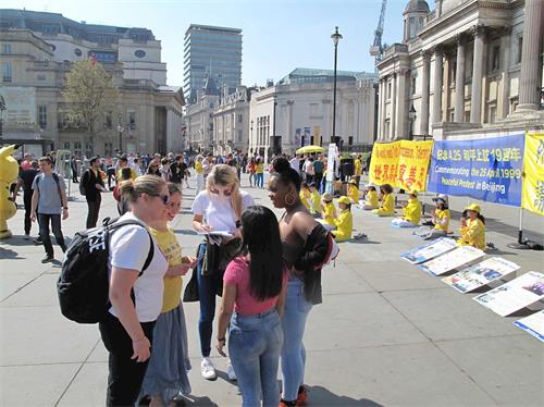 【明慧网二零一九年四月二十三日】(明慧记者方元伦敦采访报道)四月二十一日的伦敦阳光普照,晴空万里,是二零一九年迄今最温暖的一天。当天,英国法轮功学员在伦敦市中心,以及中共大使馆前、伦敦唐人街和大英博物馆门前开展系列活动,纪念“四·二五”和平上访二十周年。