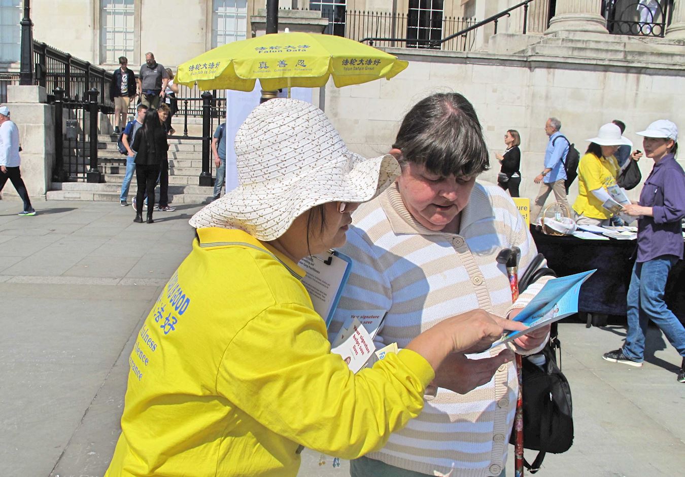 五十七岁的伦敦女士莎伦(Sharron)在特拉法加广场第一次遇到法轮功,看到“真、善、忍”横幅,径直找法轮功学员要学炼法轮功。她说:“刚才我坐在广场那边觉得自己啥也不是啥也没有,而我一走上台阶看到这个我立刻感觉我有了巨大财富(I feel I am a big bearer)。”