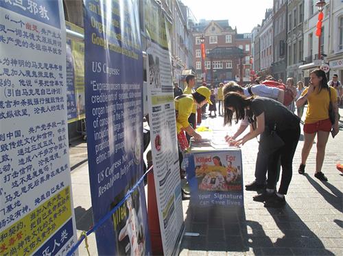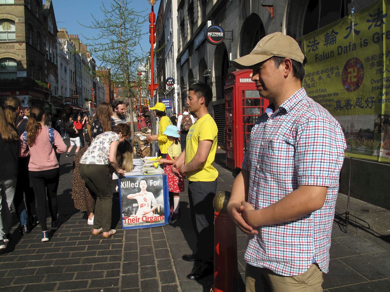 在伦敦唐人街上 各国游客与法轮功真相相连