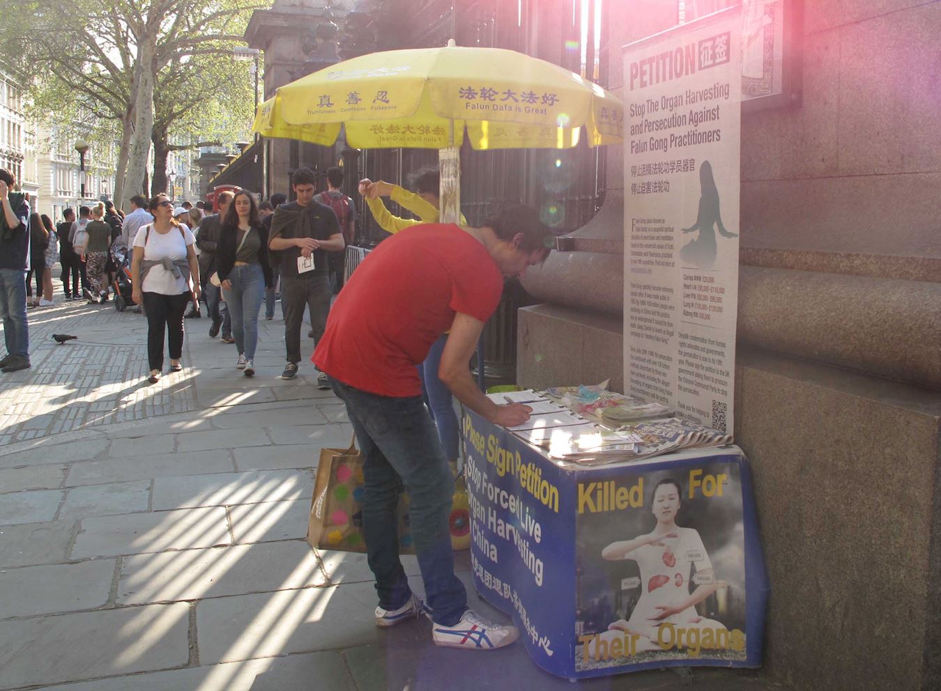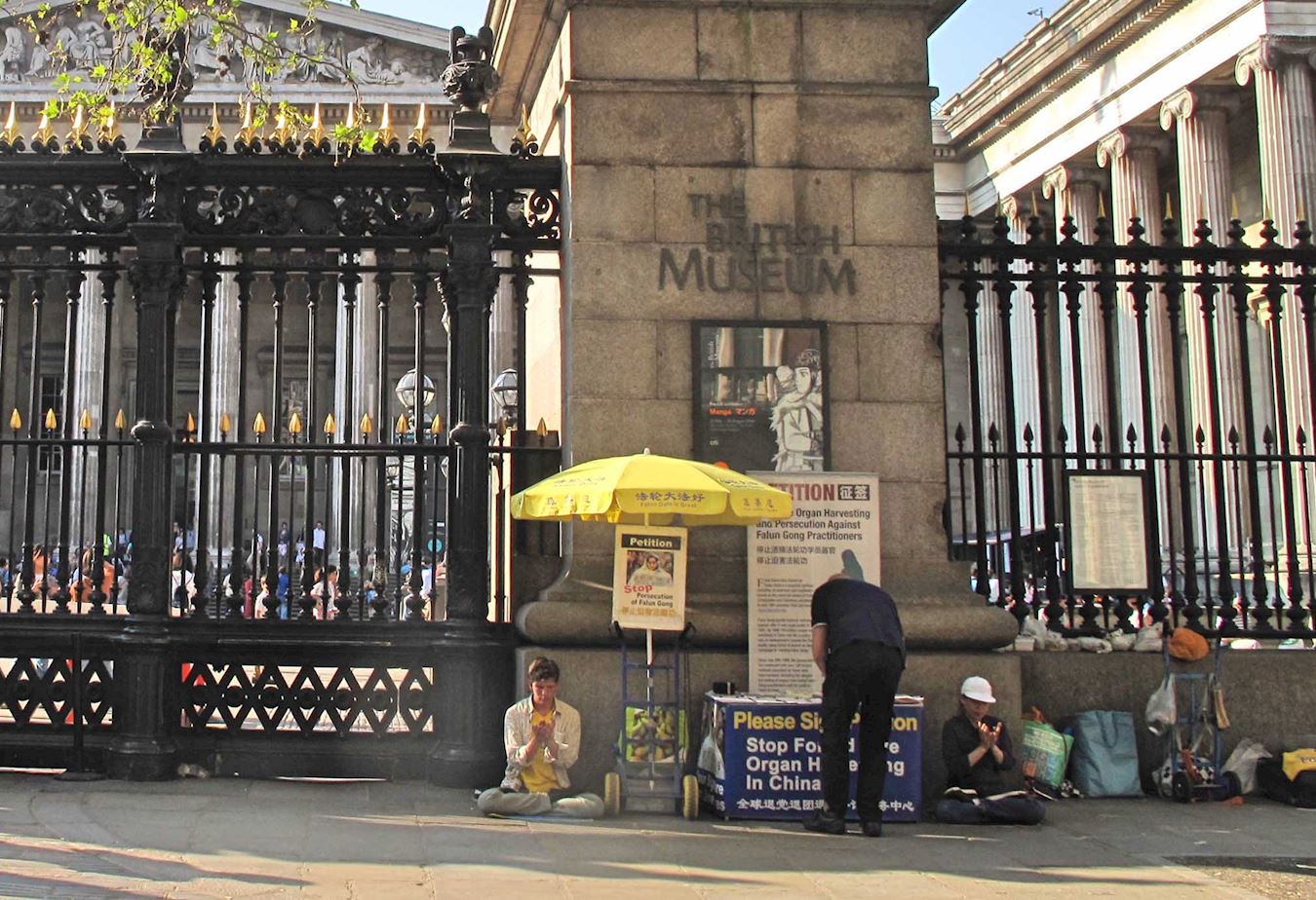 当天,多位英国法轮功学员照旧在大英博物馆门前炼功、发放法轮功真相资料和传单,讲真相,不时有人主动走过来签名支持法轮功学员反迫害。当天在进出博物馆料的人流中不乏华人面孔,他们当中有些人驻足观看展板,有些人在经过时脚步没停下,但法轮功学员展示的真相信息,“真善忍”、“法轮大法好”、“停止迫害法轮功”,还有正在炼功的法轮功学员双目微闭的平和神情触及到他们的目光。