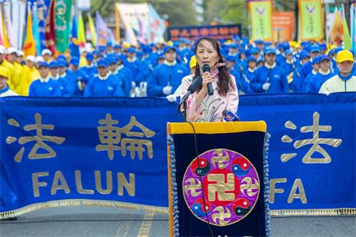 图7:法拉盛社区领袖玛莎(Martha Flores-Vazquez)女士,与法轮功学员一起参加了游行和集会。