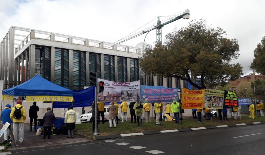 图1~2:西班牙法轮功学员在中国驻西班牙大使馆前集会,要求中共立即停止对法轮功的迫害