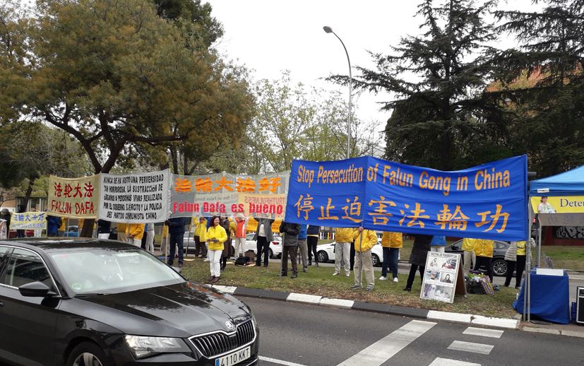 二零一九年四月六日的马德里春风料峭。上午九点开始,在中国驻西班牙大使馆前的绿地上,法轮功学员们手举“法轮大法真、善、忍”,“制止中共活摘法轮功学员器官”,“停止迫害法轮功”,“法办元凶江泽民”等横幅标语,呼吁善良的人们共同制止中共对法轮功持续二十年的邪恶迫害,要求法办迫害元凶江泽民。法轮功学员伴随着优美的炼功音乐,向市民展示法轮功功法,并向路人征签,呼吁共同制止中共对法轮功的迫害。