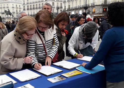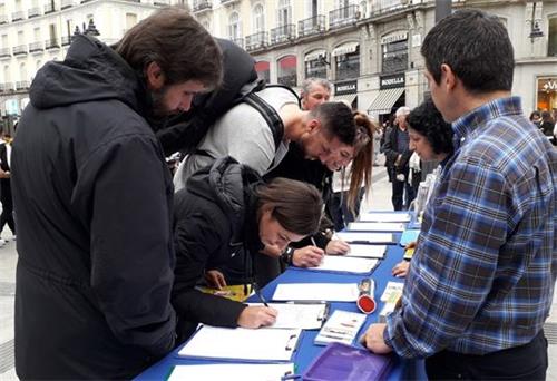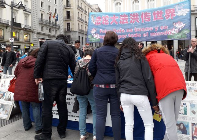 四月二十日,法轮功学员在马德里市中心最繁华的卡约尔广场举行征签活动,当“法轮大法洪传世界”的横幅及法轮功真相展板刚摆放好,马上就有过往民众过来观看,当人们了解了法轮功及被中共迫害的真相后,纷纷签字声援法轮功反迫害。