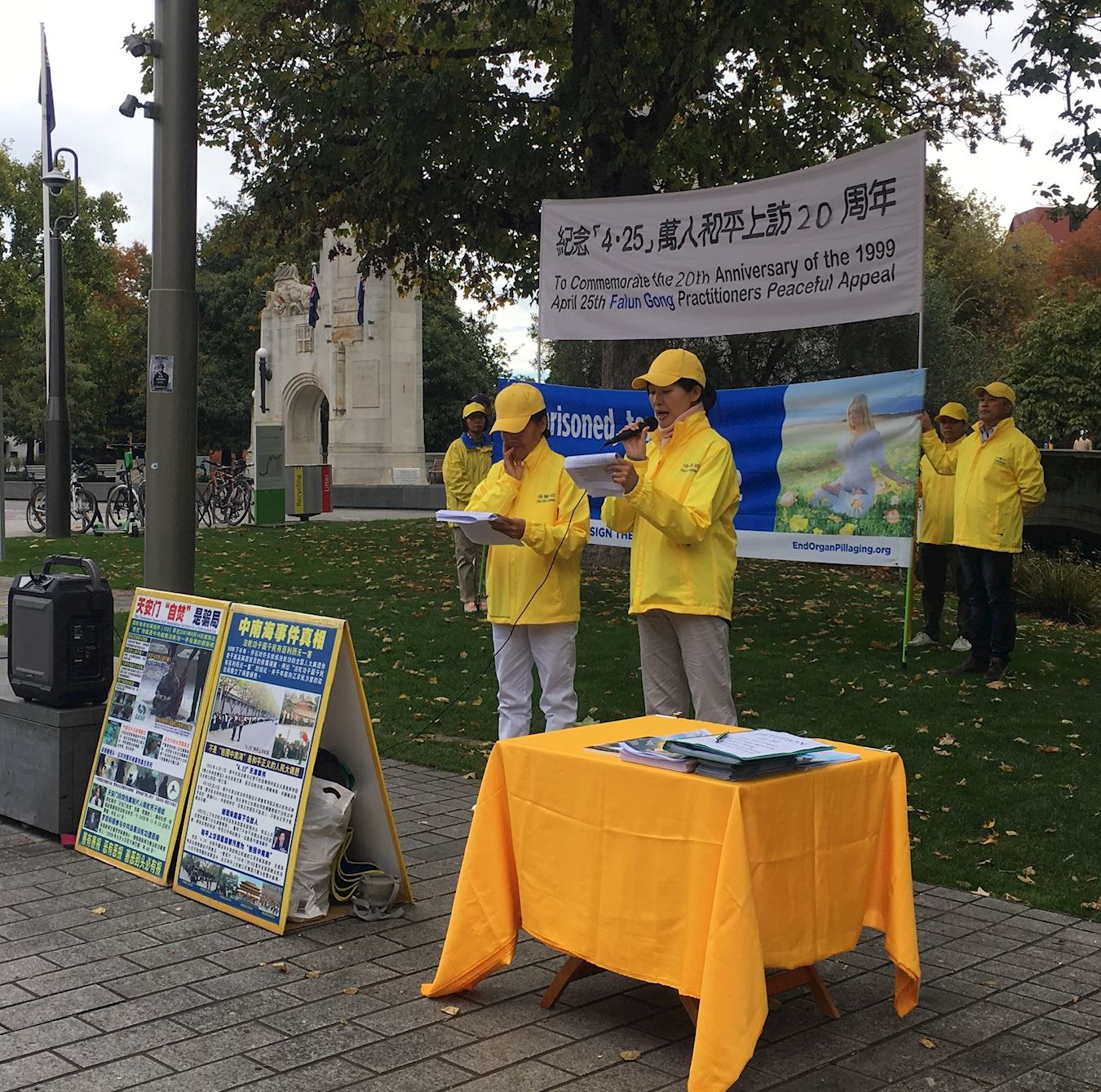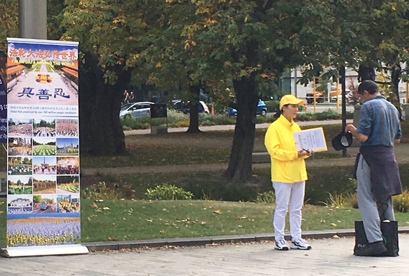 【明慧网二零一九年四月二十五日】南半球新西兰仲秋时节,二零一九年四月二十日中午,在基督城的一战纪念桥边,法轮功学员集会纪念“四二五”万人和平上访二十年。集会上,学员们向市民、游客展示法轮功的功法、散发真相资料,揭露中共对法轮功学员的残酷迫害及活摘器官的暴行。很多行人主动在征签表上签字,表达对中共迫害善良民众的谴责。