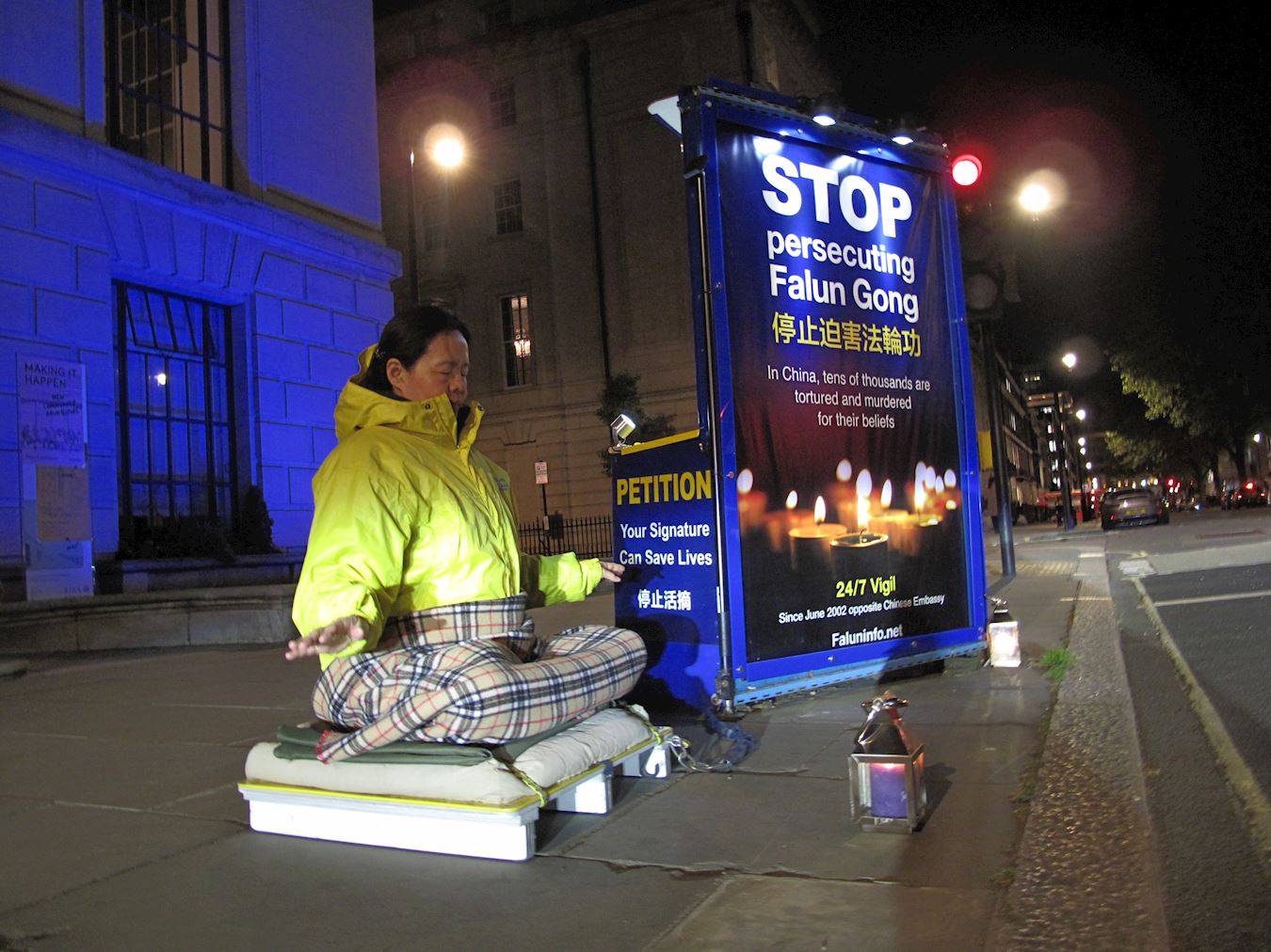 ![]() 图1: 二零一九年四月二十五日夜,法轮功学员高女士在伦敦中使馆前平抗议,法轮功学员在这里的持续和平抗议始于二零零二年六月。 |
