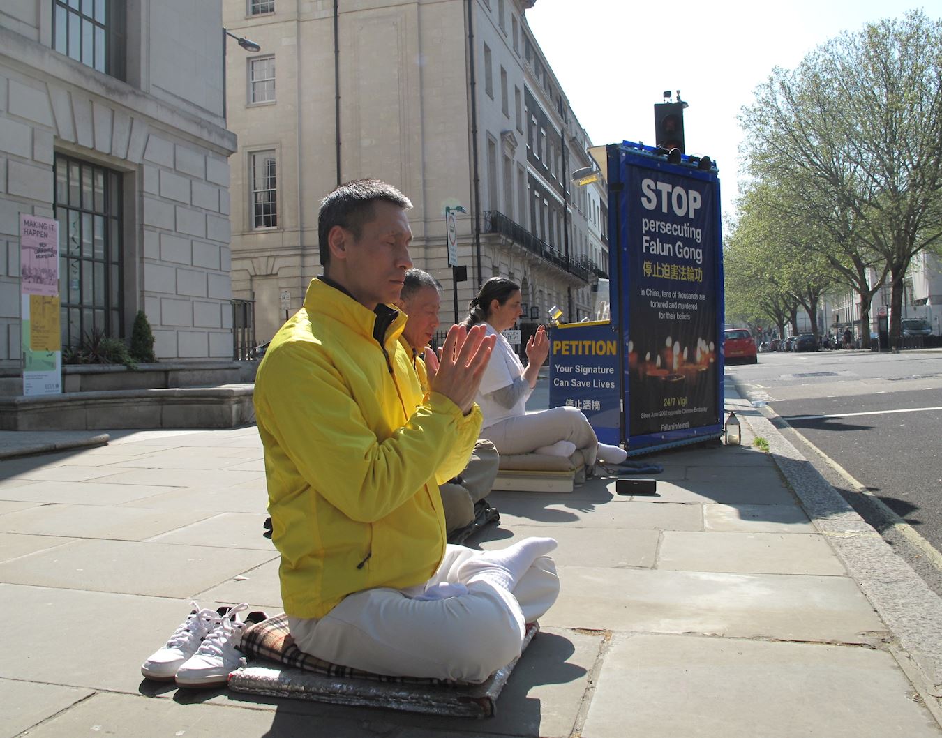 ![]() 图2:二零一九年四月二十一日,英国法轮功学员举行活动纪念“四·二五”和平上访二十周年,上午十一时,在伦敦中使馆对面,法轮功学员谢卫国、老于和里拉(Lilach)正在打坐发正念 |