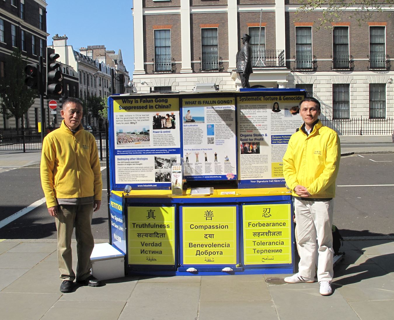 现居伦敦的法轮功学员老于在和平抗议真相点值班,二十年前他和年近八十的母亲一起参加了法轮功“四·二五”和平上访,当时他是中共政府某部委的工作人员。与谢卫国一起回忆“四·二五”,他感恩法轮大法赐予他真正的法理,给他和平理性反迫害的智慧和勇气。