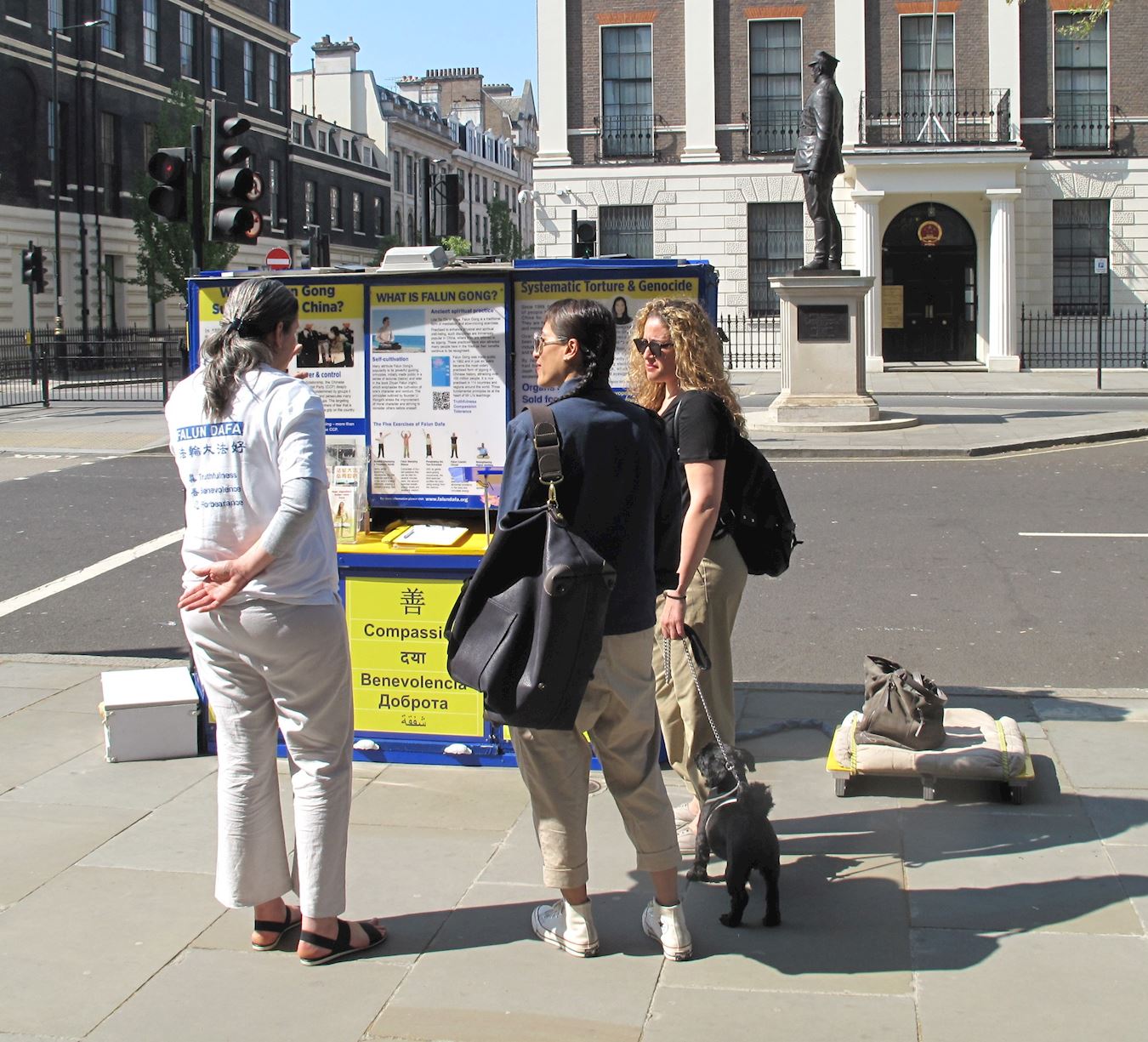 ![]() 图4:在伦敦中使馆对面,法轮功学员里拉(Lilach)在给两位路人讲真相,两人在明白真相后签名反迫害 |