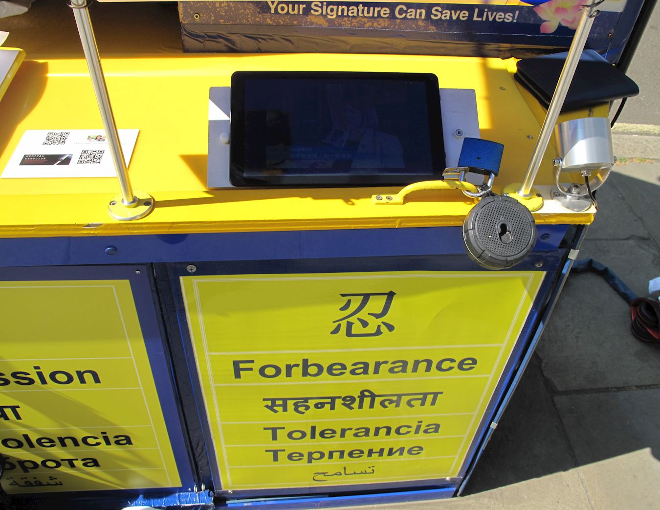 为了突破语言不通的限制,她准备了一个法轮功真相资料播放器,并精心挑选了一系列真相新闻专题片,每到她来值班时就带来,摆放在真相展板前。“我希望更多的中国人来看我为他们准备的真相新闻和记录片”,里拉说。