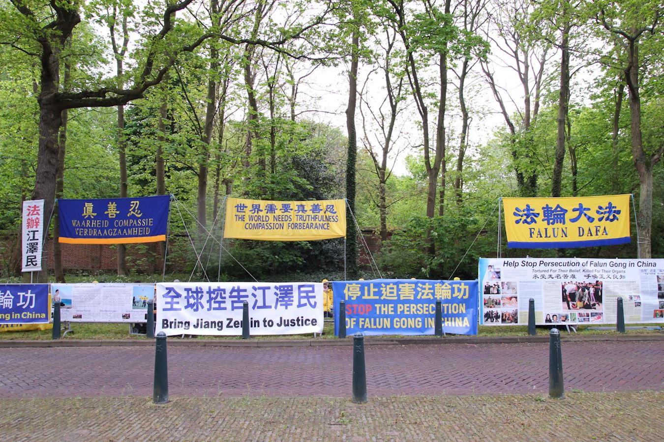 这一天,几十名来自荷兰各地的法轮功学员早早来到中共大使馆门前,正对着大使馆的建筑悬挂几条横幅,上书中英文大字:“法轮大法”、“世界需要真善忍”,“法办江泽民”、“全球控告江泽民”、“停止迫害法轮功”等。还有一幅图文并茂的展板,显示中共邪党迫害法轮功的真相,以及警察酷刑大法弟子的真相,活体摘取法轮功学员器官的真相。
