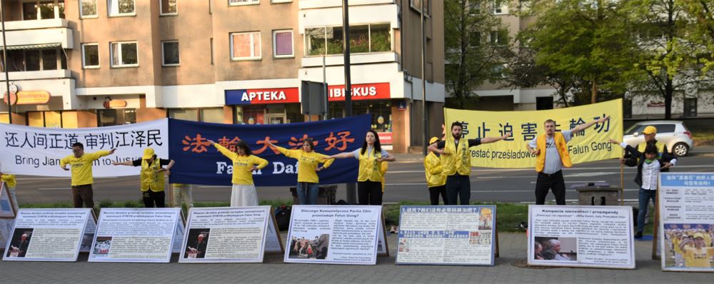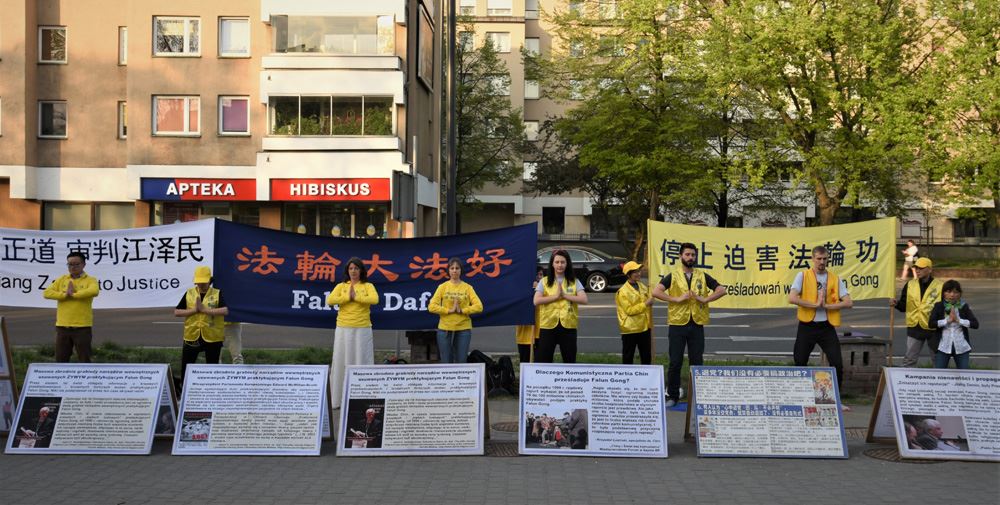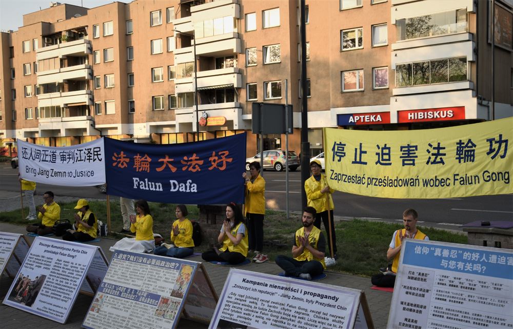 ![]() 图1~3:纪念“四·二五”二十周年 波兰法轮功学员四月二十五日晚在中使馆前集体静坐炼功,抗议中共迫害法轮功 |