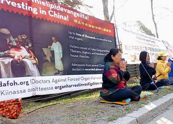 四月二十四日,芬兰法轮功学员来到首都赫尔辛基中领馆前,和平静坐,纪念法轮功学员“四·二五”和平上访二十周年。