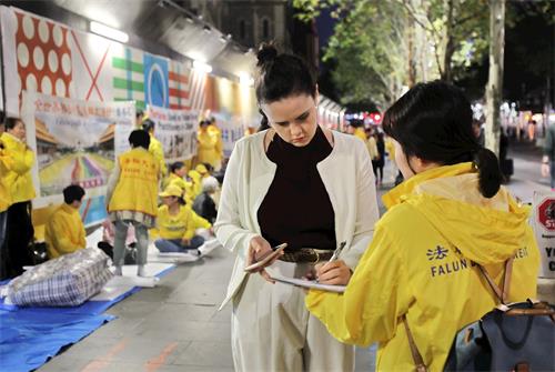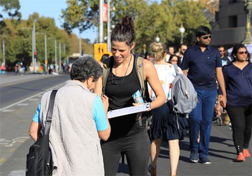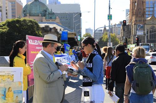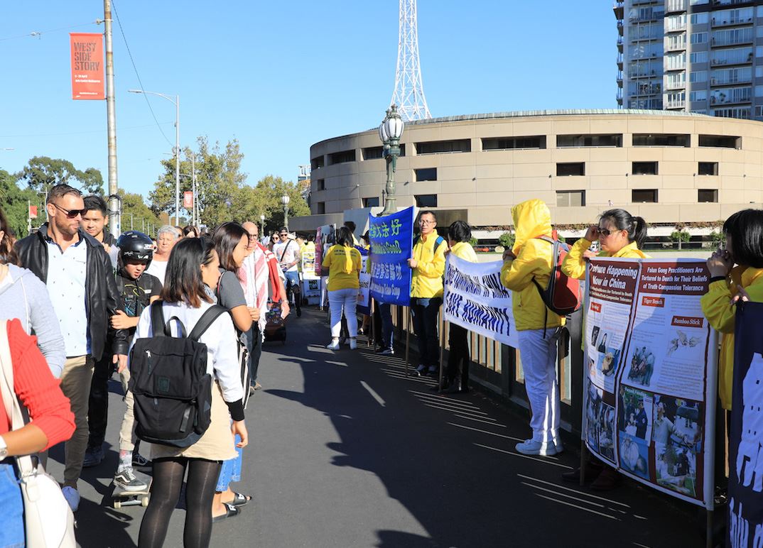 【明慧网二零一九年四月二十九日】(明慧澳洲墨尔本记者站采访报道)二零一九年四月二十五日,在“四·二五”万名法轮功学员和平上访二十周年之际,墨尔本部份法轮功学员分别于午后及晚间,在市中心王子桥和城市广场(City Square),举行纪念活动,向市民和游客展示法轮大法学员和平理性反迫害的真相。