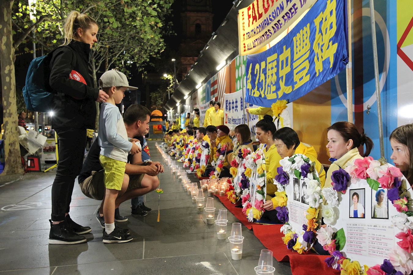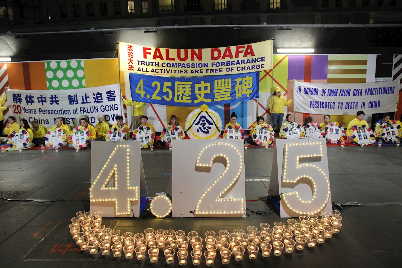 当晚,来自各族裔的法轮功学员举行了烛光夜悼活动,悼念为坚持真、善、忍原则而被中共迫害致死的中国大陆大法弟子。在点点烛光映衬下,学员们和平静坐,场面庄严肃穆、纯净祥和,吸引市民和游客驻足了解真相。