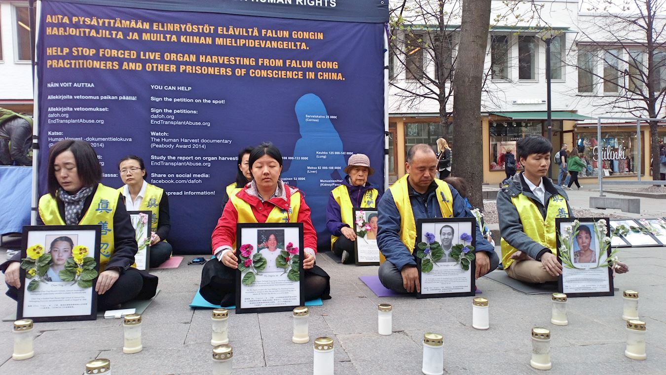 ![]() 图2:四月二十四日下午,学员来到首都赫尔辛基市中心举办烛光守夜活动,传播法轮功真相。 |