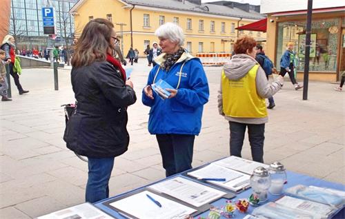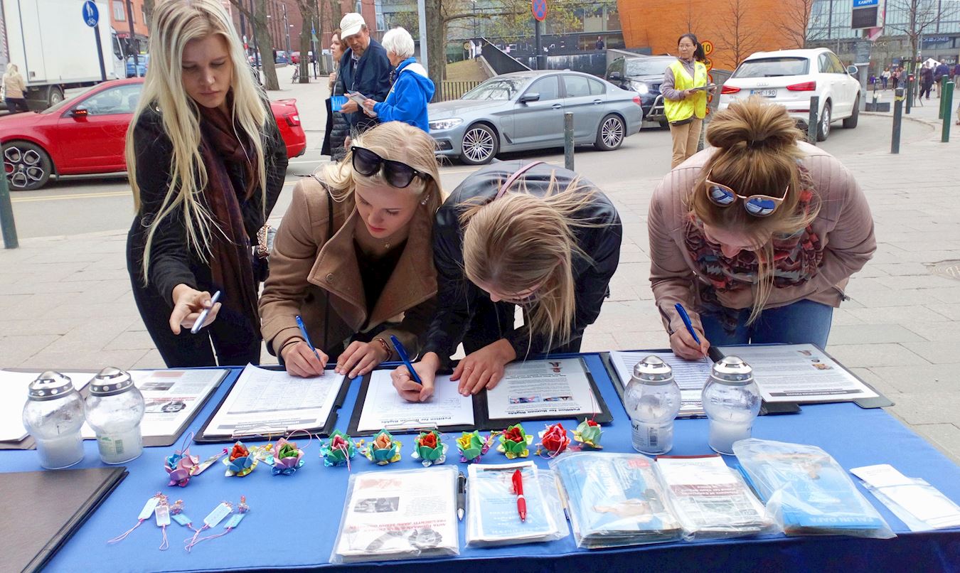 ![]() 图3~5:赫尔辛基市中心市民聆听真相,并踊跃签名支持制止迫害。 |