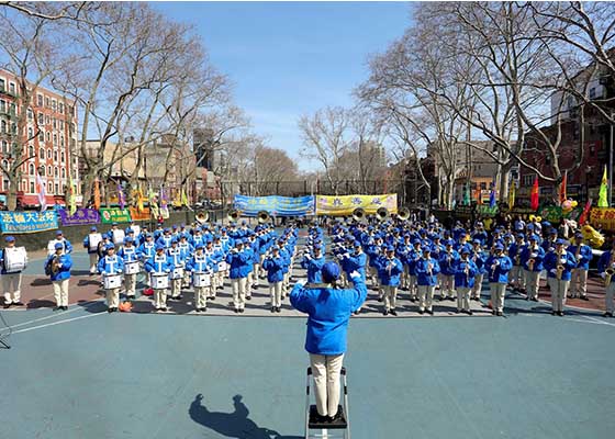 四月七日,阳光明媚,春风佛面,纽约部份法轮功学员来到曼哈顿中国城,在华埠罗斯福公园为民众献上“春天的庆典”。