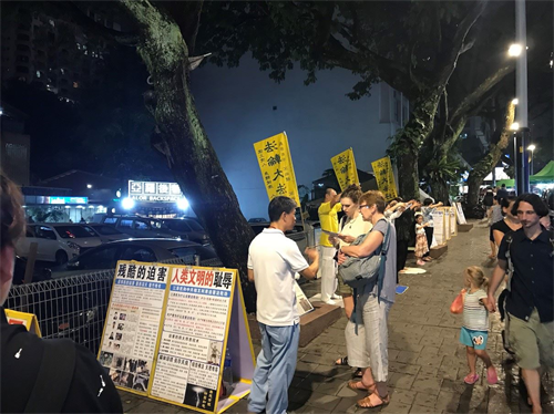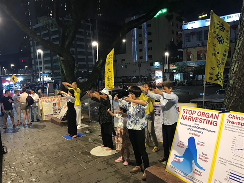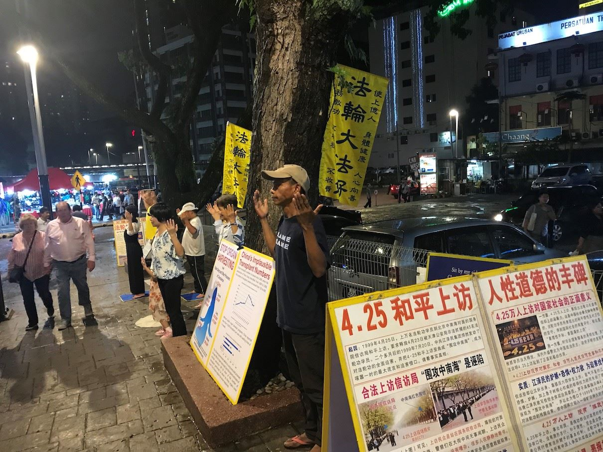 【明慧网二零一九年五月一日】继四月二十日在中共驻马大使馆前举行集会并递交抗议信后,部份马来西亚法轮功学员于二零一九年四月二十五、二十六连续两日,在夜幕降临之时,来到吉隆坡市中心繁华的夜市亚罗街,以集体炼功、打横幅和烛光夜悼的形式,再度纪念“四二五”和平上访二十周年,同时向大陆及各国游客和当地居民讲述法轮功在中国大陆被迫害的真相。