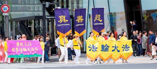 游行队伍由英姿飒爽的天国乐团打头阵,接下来是令人耳目一新的仙女队和手持各种颜色横幅的学员,最后是身穿黄色民族服装的腰鼓队压阵。游行队伍缓缓前行,构成东京街头的一道亮丽的风景。