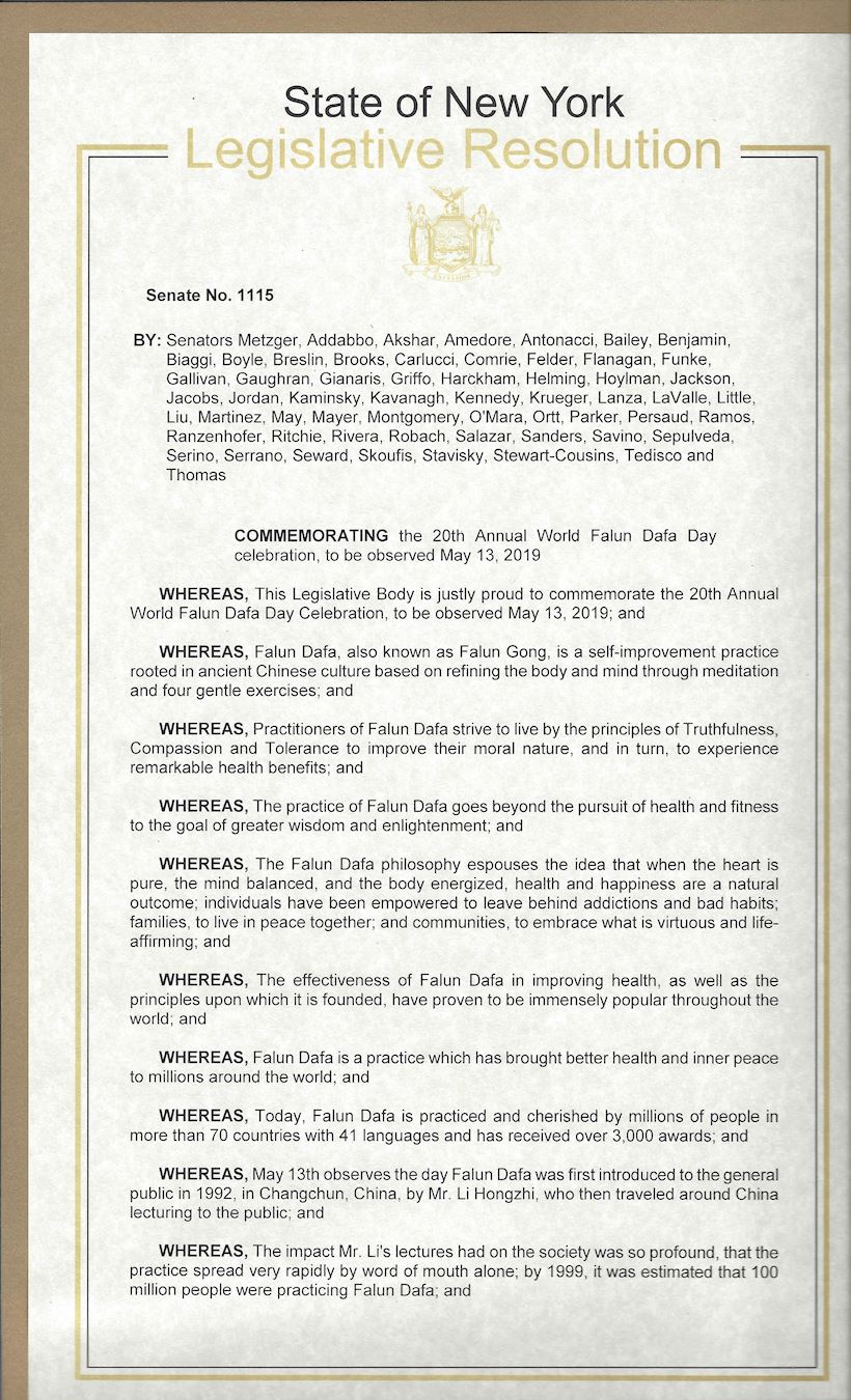 鉴于,本立法机构非常自豪地恭贺二零一九年五月十三日暨第二十届世界法轮大法日;