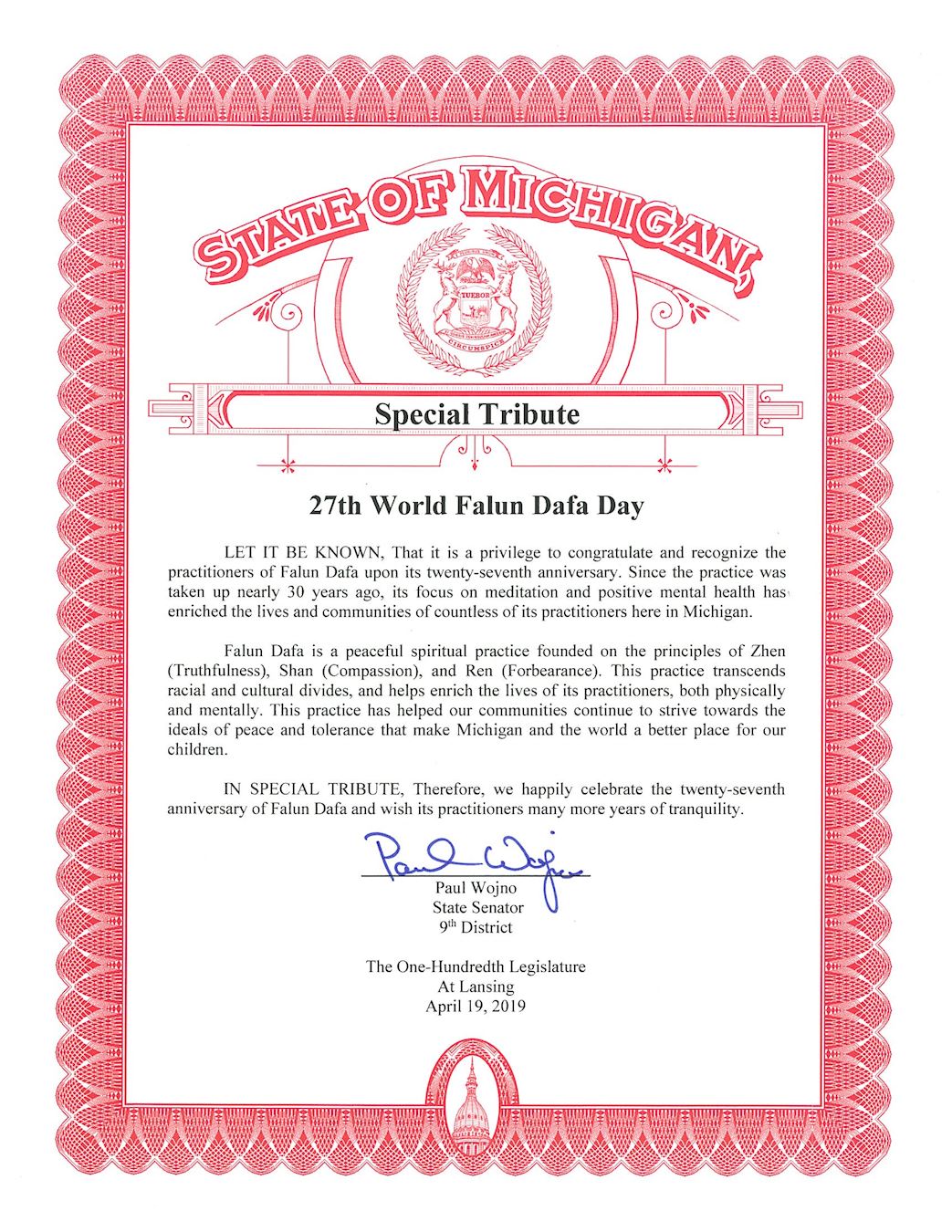 来自密西根州第九选区的州参议员保罗 沃伊诺(Paul Wojno)在褒奖信中说:“法轮大法是一种建立在真、善、忍原则上的和平精神信仰。这种信仰超越了种族和文化的分歧,有助于丰富其学员的身心生活。这种信仰帮助我们的社区继续努力实现和平与宽容的理念,使密西根和世界变得更加美好。”