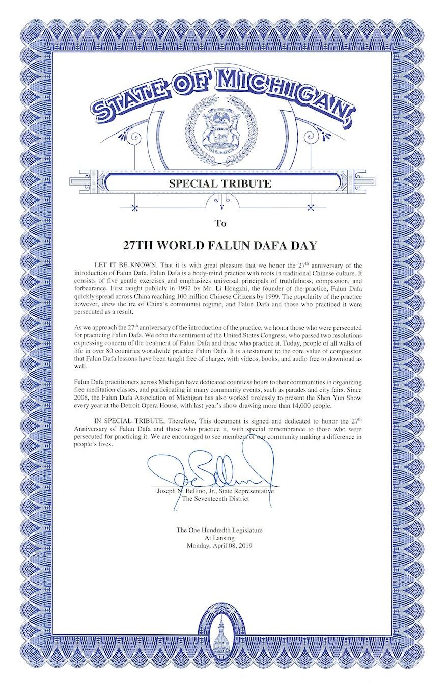 来自密西根州第十七选区的州议会众议员约瑟夫·贝利诺(Joseph N. Belino, Jr)在褒奖信中说:“法轮大法的创始人李洪志先生于一九九二年首次公开传授法轮大法。到一九九九年,在中国的学员人数迅速增加到一亿人。然而,这种功法的普及却引起了中共政权的愤怒。 法轮大法的学员因此受到了残酷的迫害。”