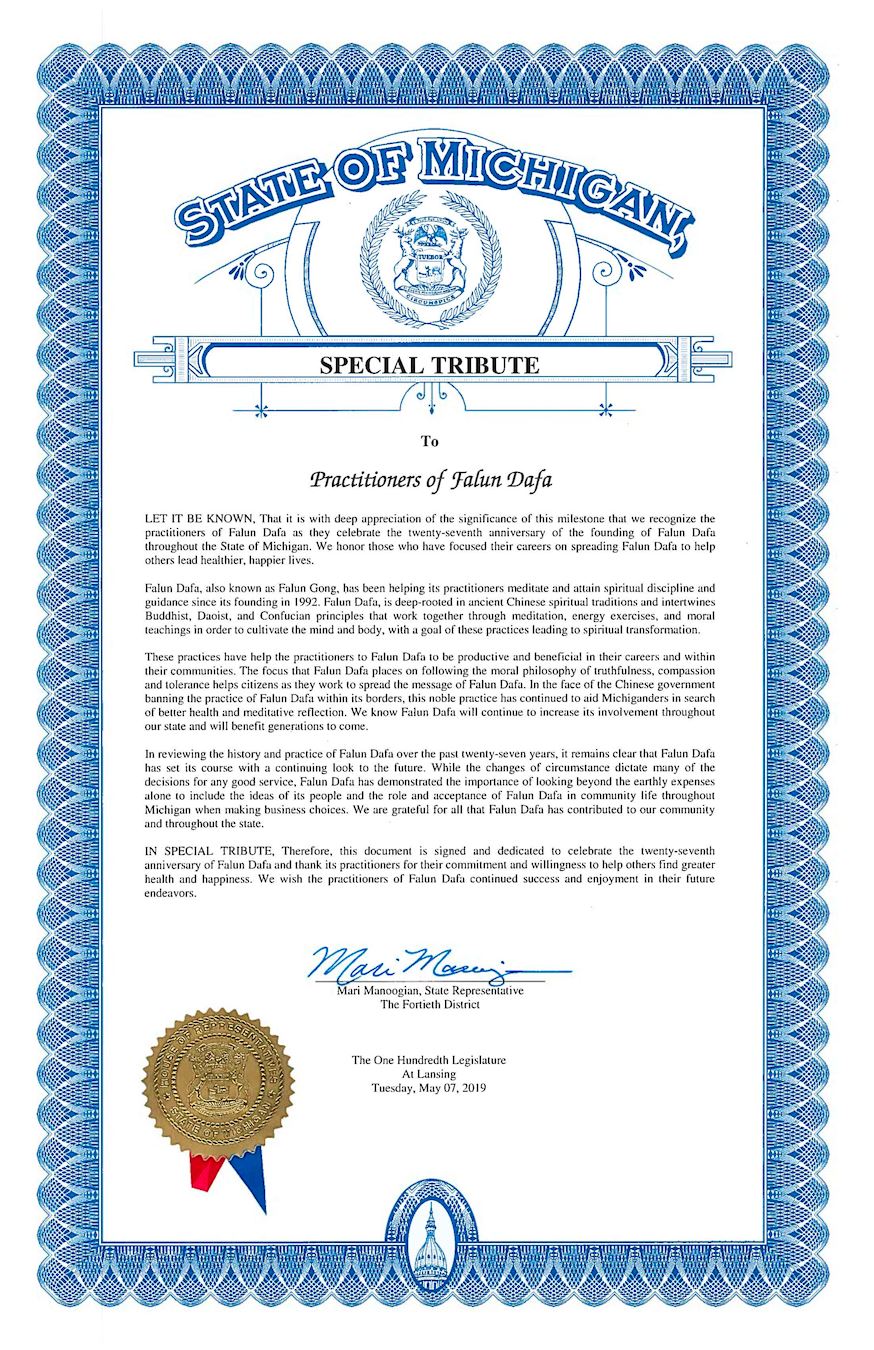 来自密西根州第四十选区的州众议员玛丽·马努吉安(Mari Manoogian)在她的褒奖信中说:“尽管在中国大陆受到中共的迫害,这种高德大法却继续在密西根州为那些寻求更健康的功法的人们提供了帮助。我们深信,法轮大法将在密西根更受欢迎,并造福于子孙后代。