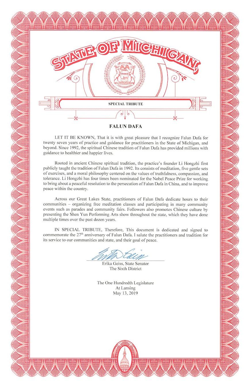 【明慧网二零一九年五月十日】五月十三日是世界法轮大法日,也是法轮大法弘传世界二十七周年。在二零一九年世界法轮大法日到来之际,美国密西根州法轮大法学会共收到十一位州参众两院的议员们发来的褒奖感谢信。褒奖信中感谢法轮大法给密西根州社区带来的积极影响,感谢密西根州的法轮功学员为密西根居民的无私奉献,并期望更多的密西根居民从法轮大法的洪传中得到身心的改善。