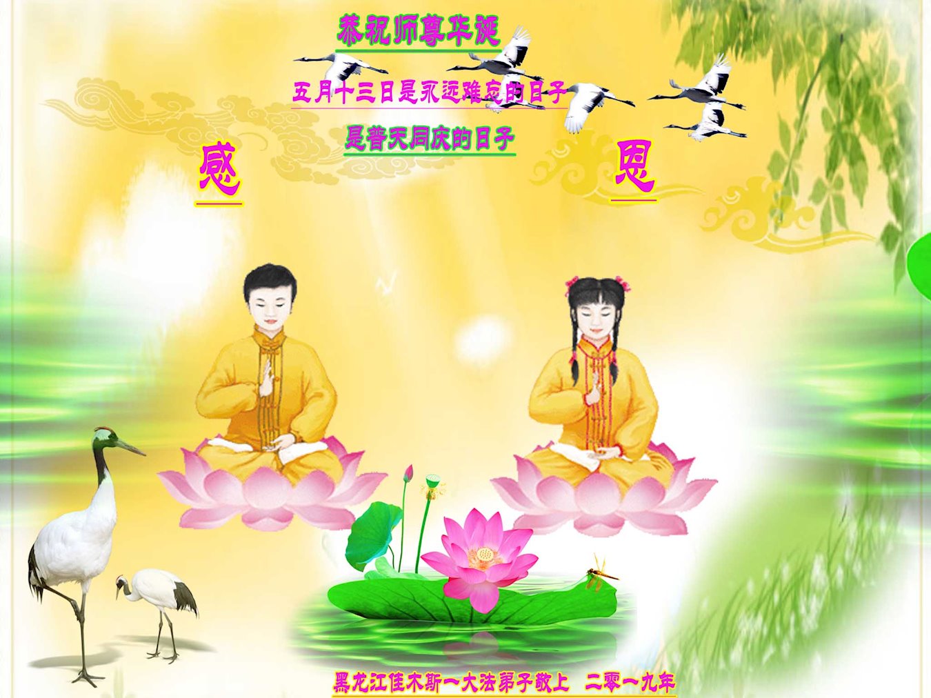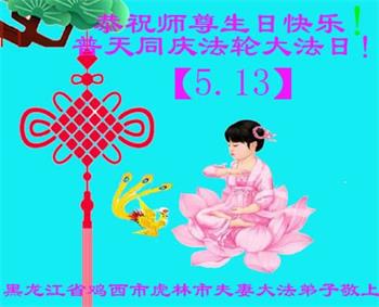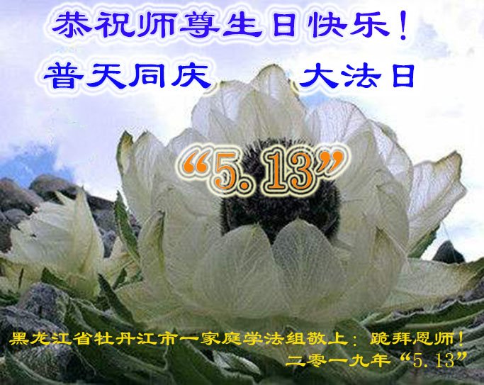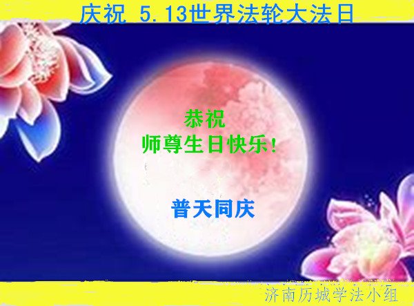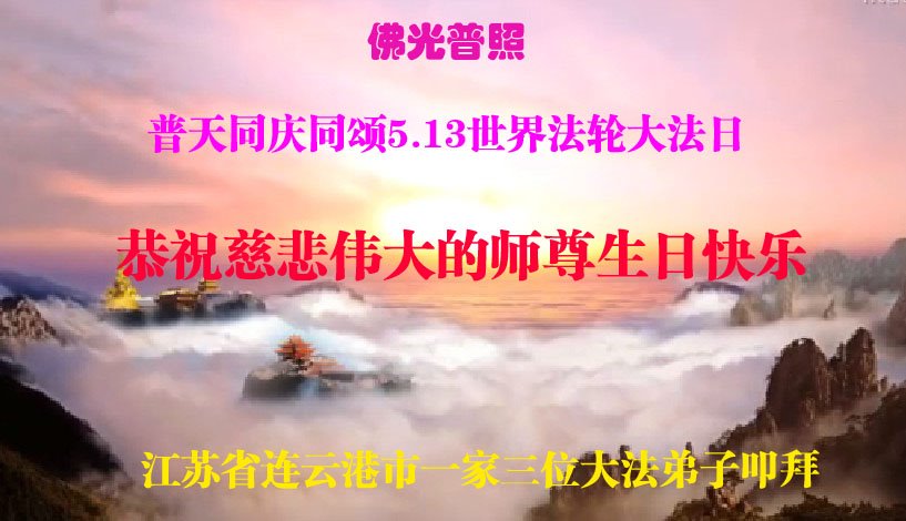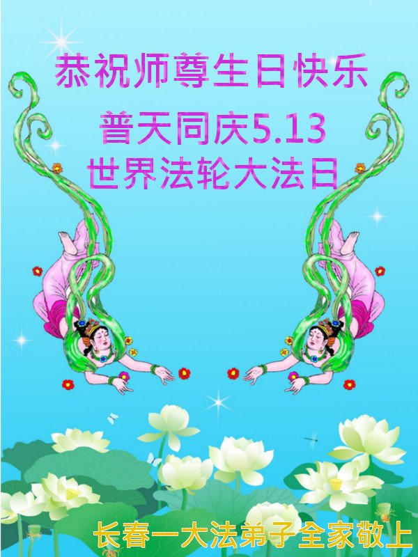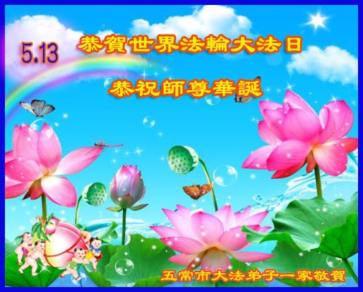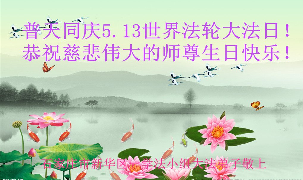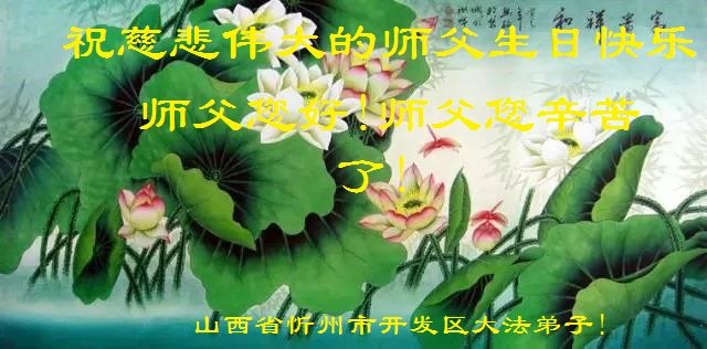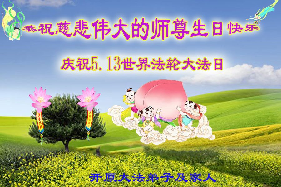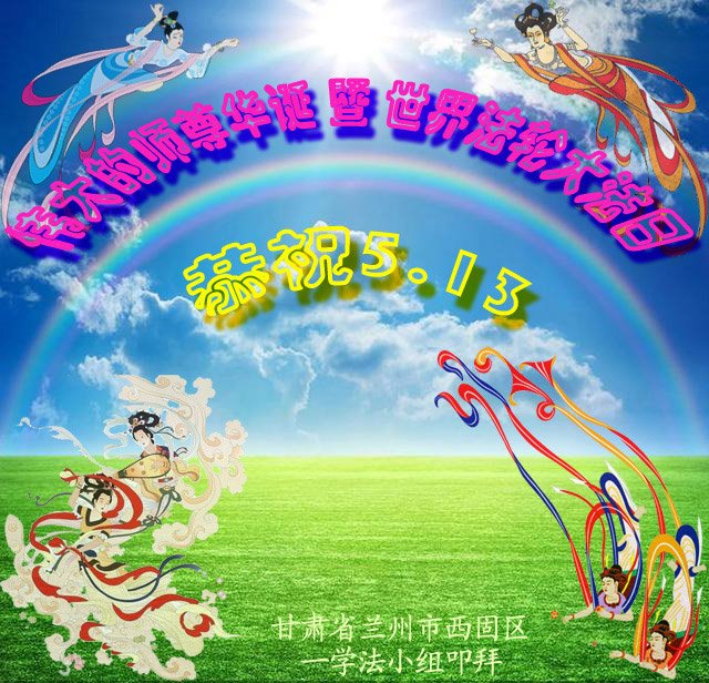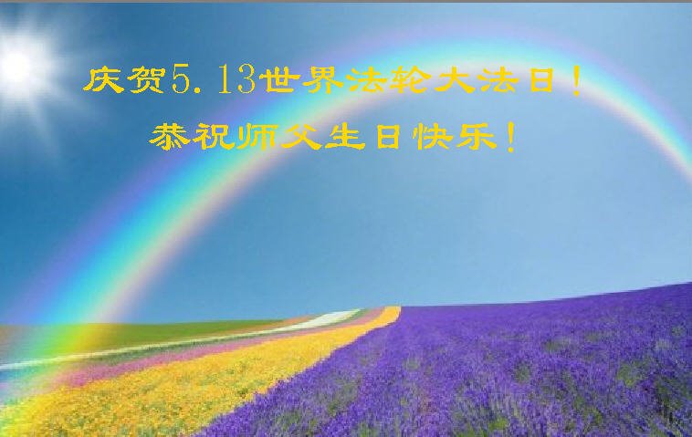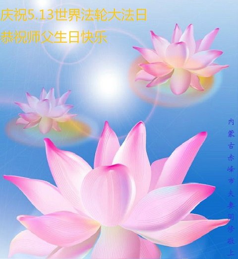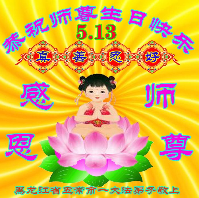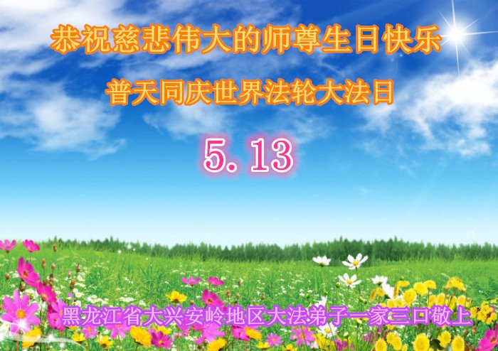“五·一三”世界法轮大法日暨慈悲伟大师父的华诞到了!我们一家同修三人及我们现在的学法小组全体弟子在此衷心恭祝慈悲伟大的师父生日快乐!发自内心的感恩慈悲无量的伟大的师父!是您的慈悲救度,弟子们才有了今天。