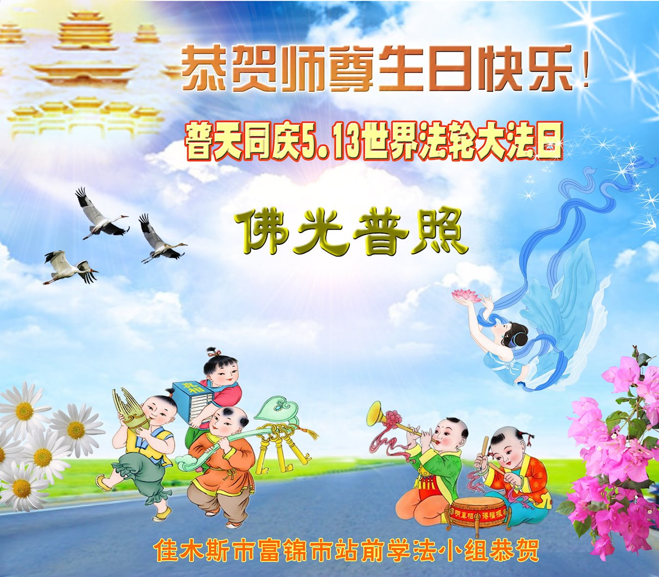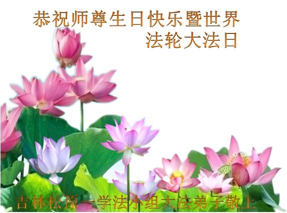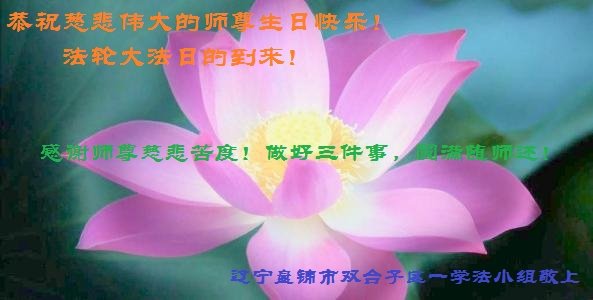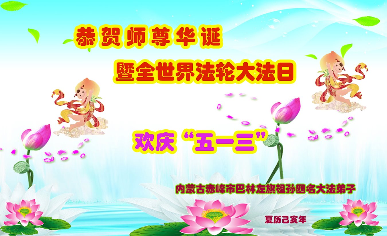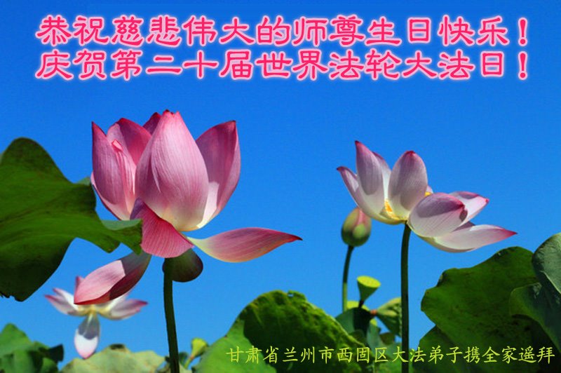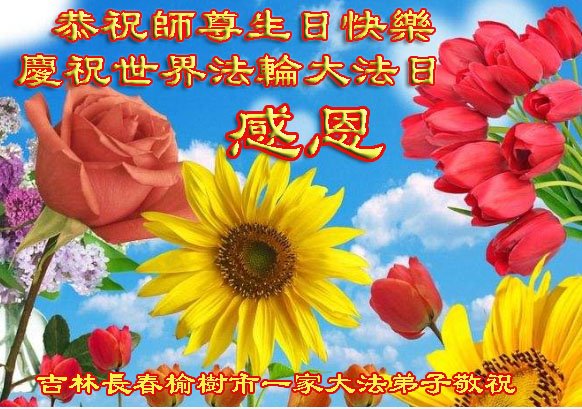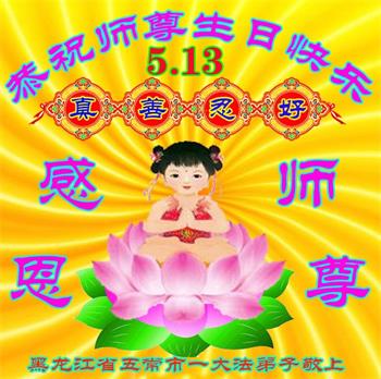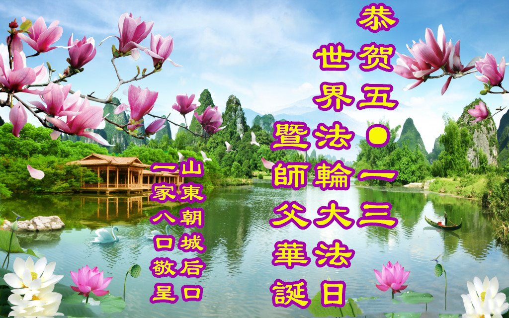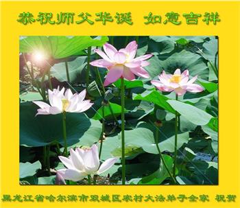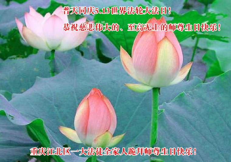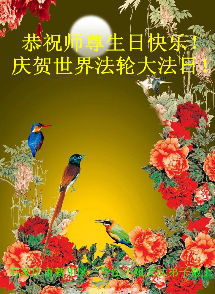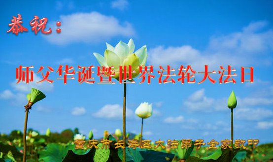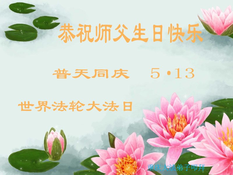 “五·一三”世界法轮大法日暨慈悲伟大师父的华诞到了!我们一家同修三人及我们现在的学法小组全体弟子在此衷心恭祝慈悲伟大的师父生日快乐!发自内心的感恩慈悲无量的伟大的师父!是您的慈悲救度,弟子们才有了今天。