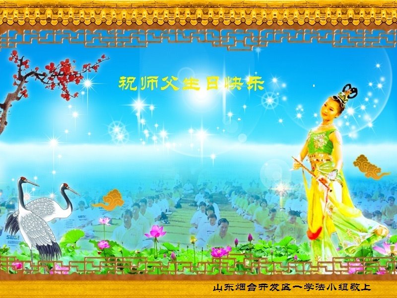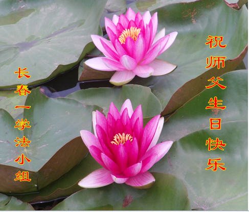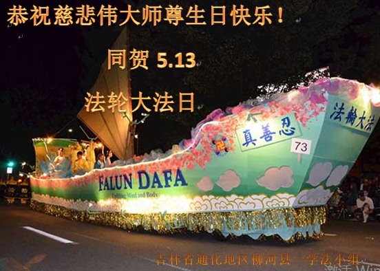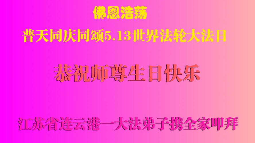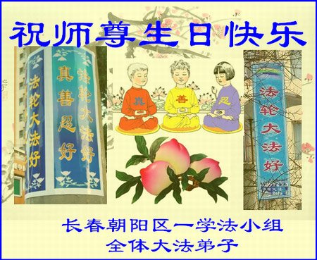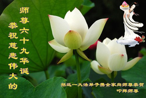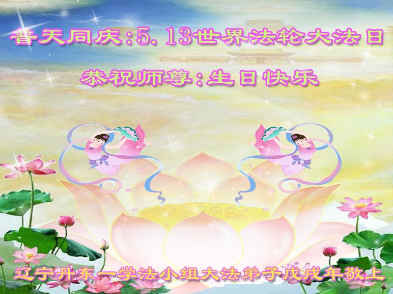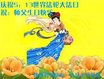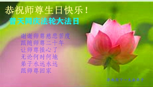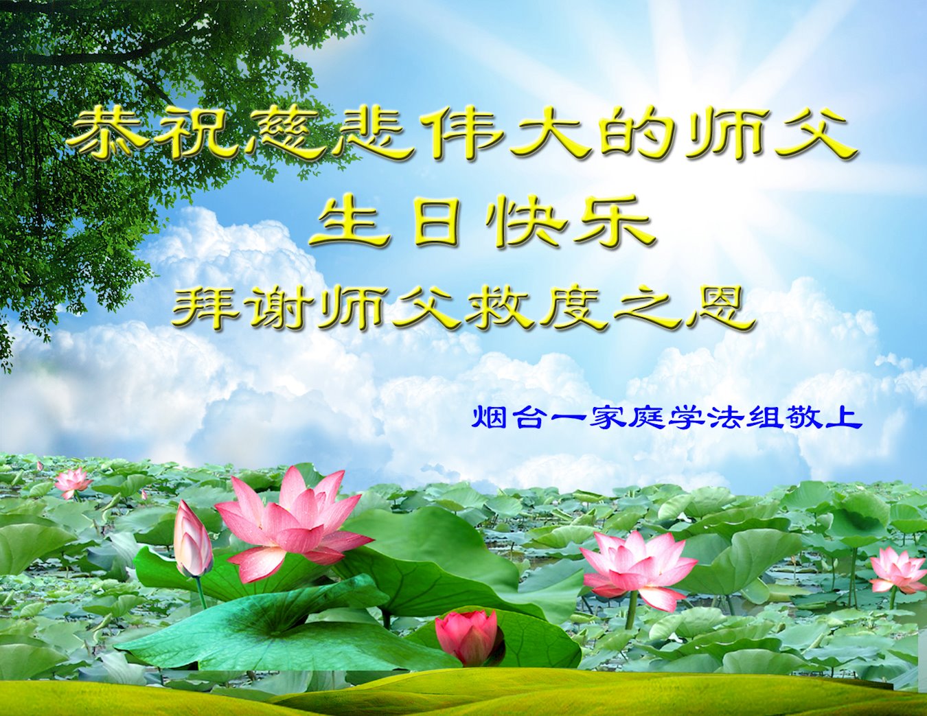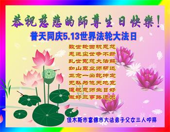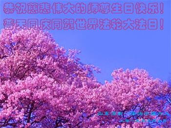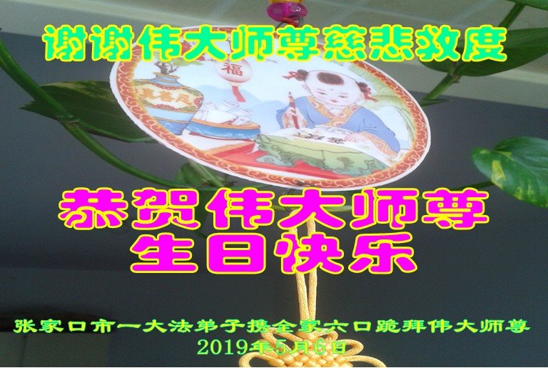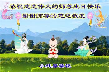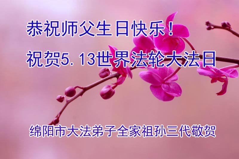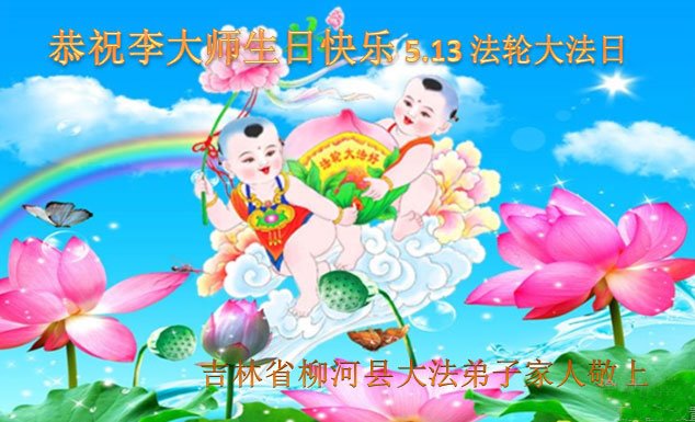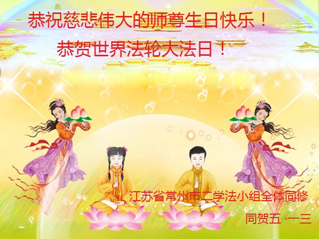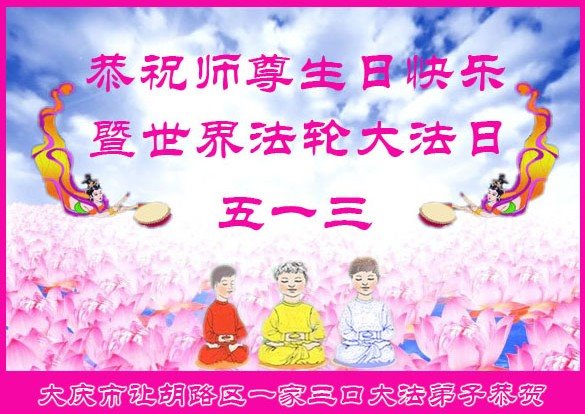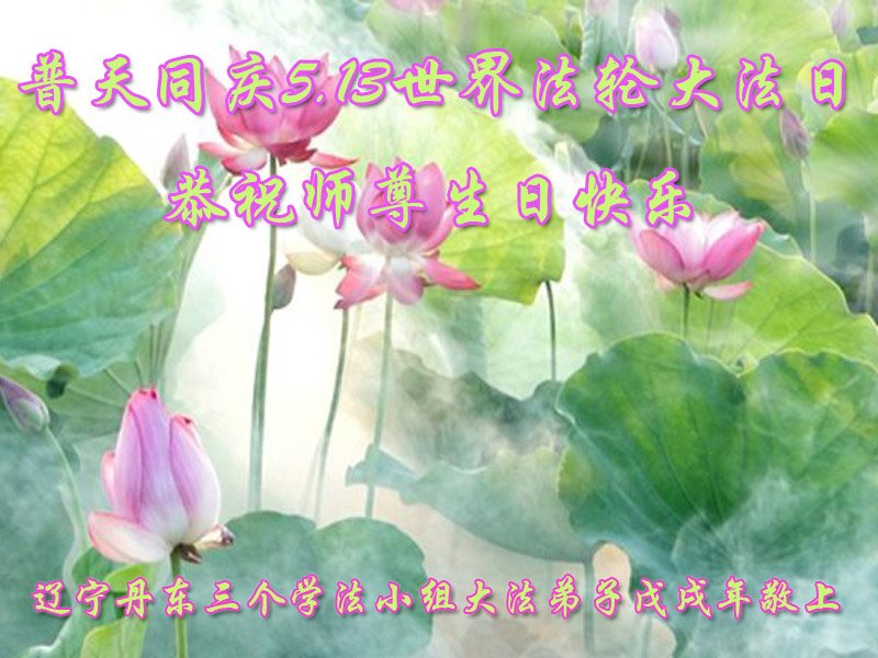 “五·一三”世界法轮大法日暨慈悲伟大师父的华诞到了!我们一家同修三人及我们现在的学法小组全体弟子在此衷心恭祝慈悲伟大的师父生日快乐!发自内心的感恩慈悲无量的伟大的师父!是您的慈悲救度,弟子们才有了今天。