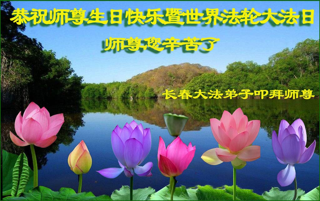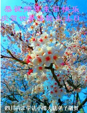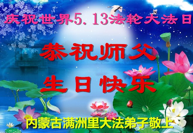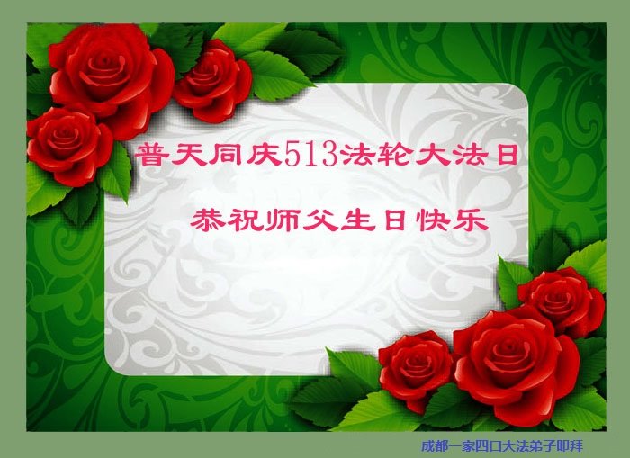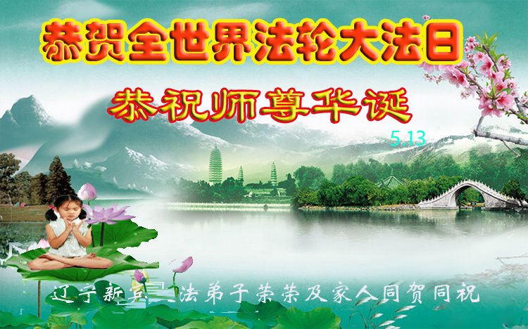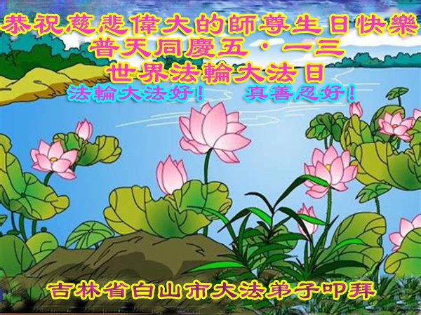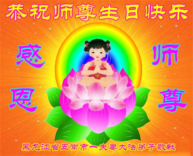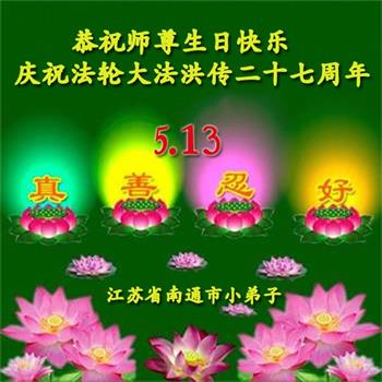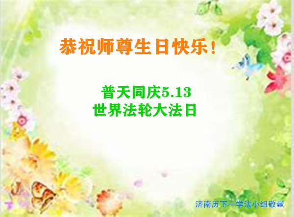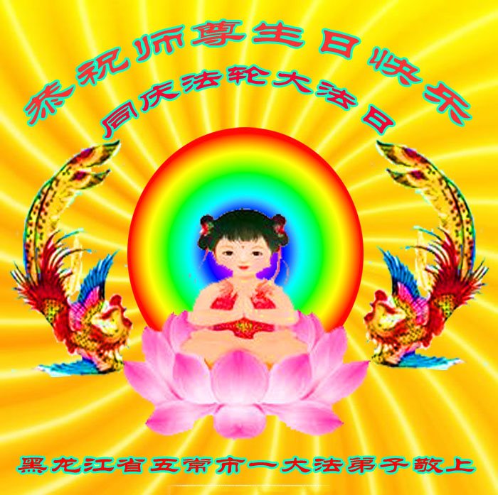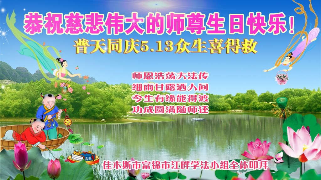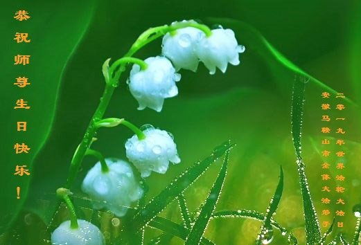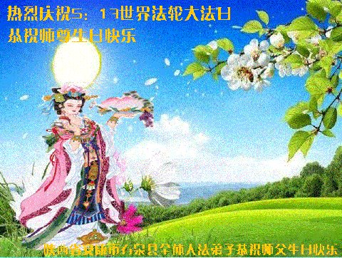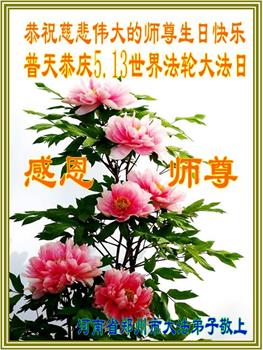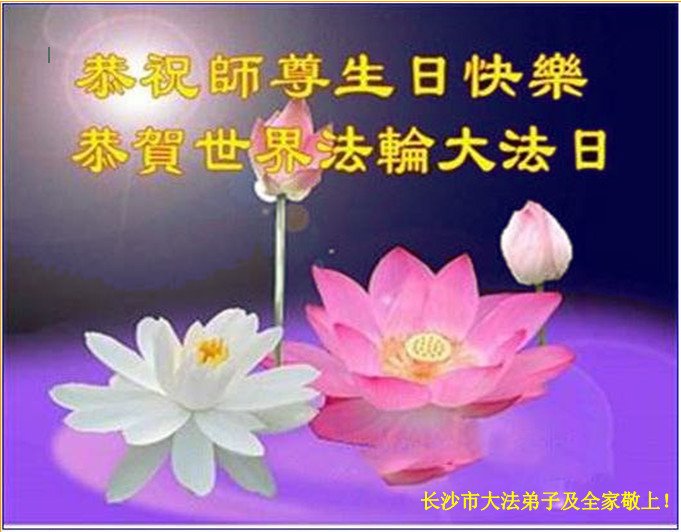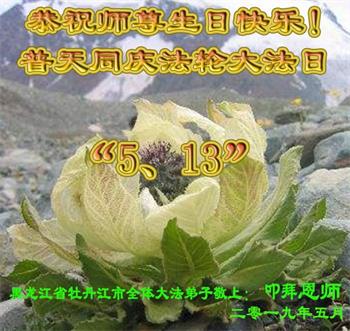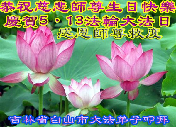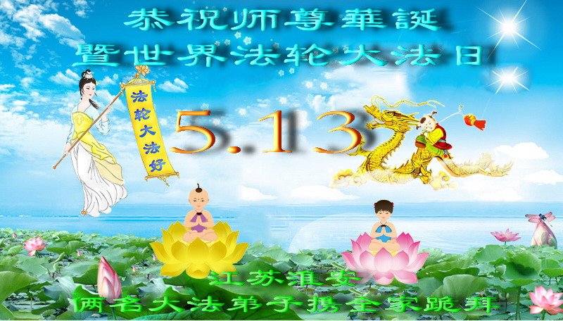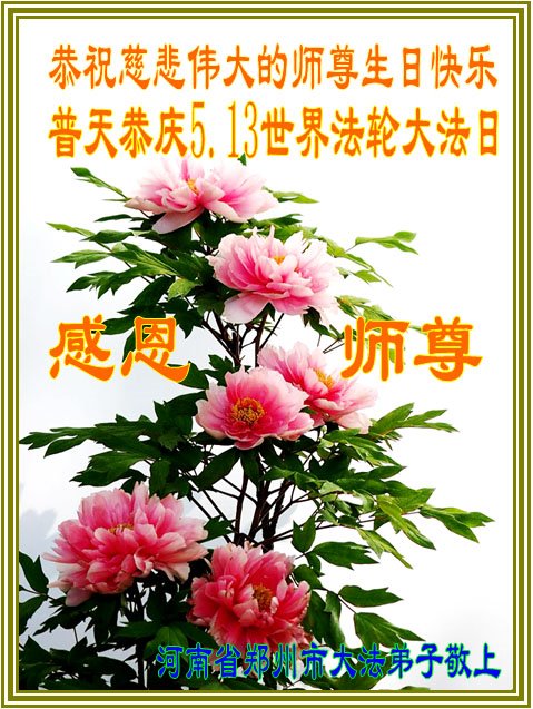 “五·一三”世界法轮大法日暨慈悲伟大师父的华诞到了!我们一家同修三人及我们现在的学法小组全体弟子在此衷心恭祝慈悲伟大的师父生日快乐!发自内心的感恩慈悲无量的伟大的师父!是您的慈悲救度,弟子们才有了今天。