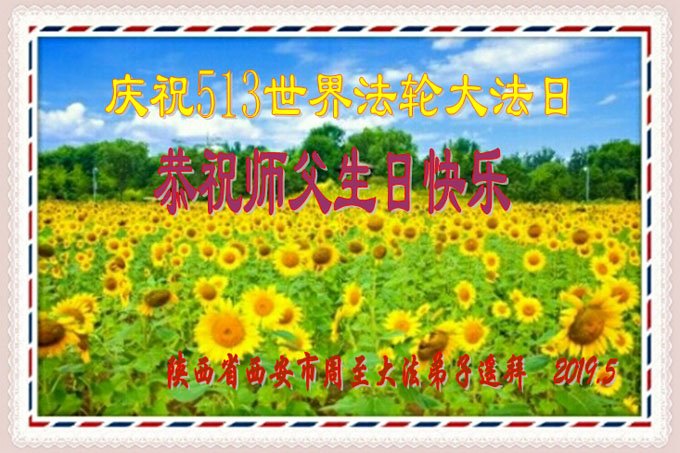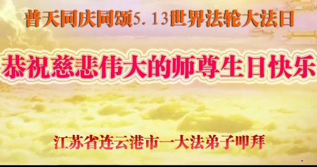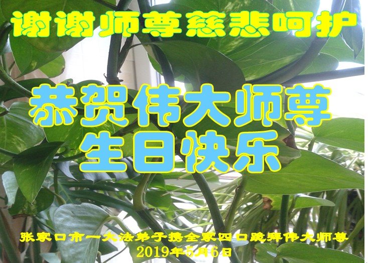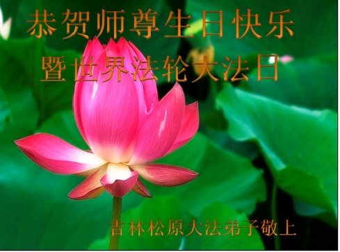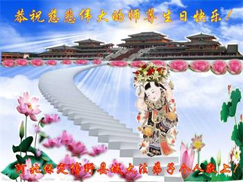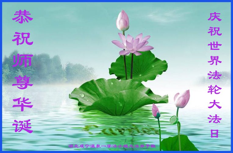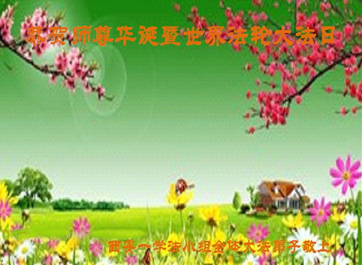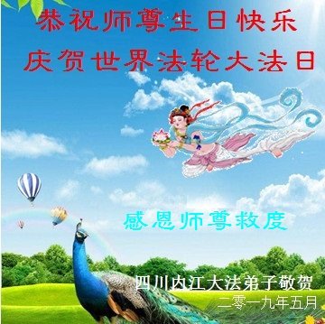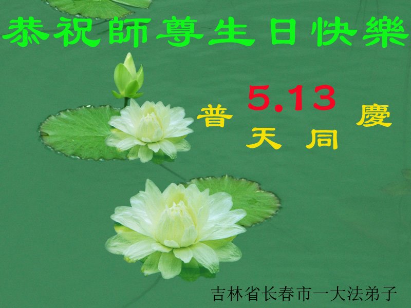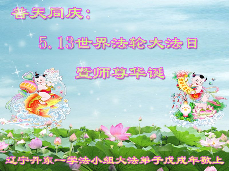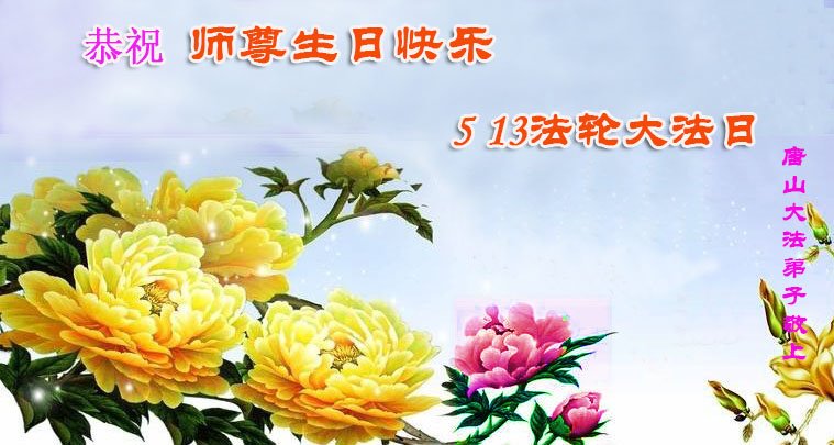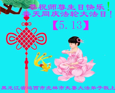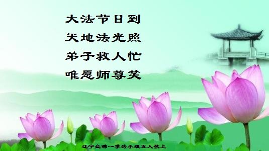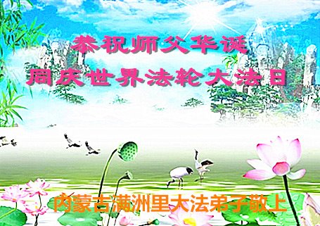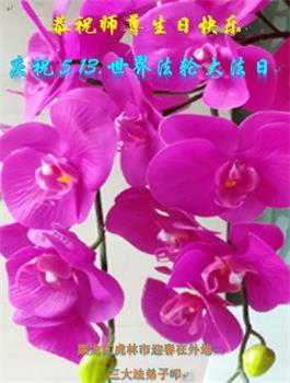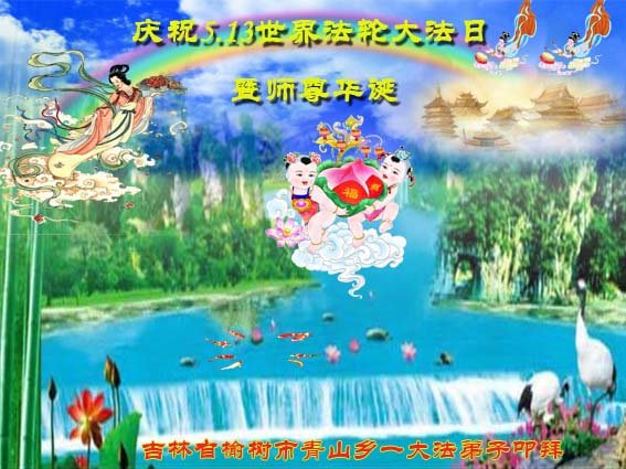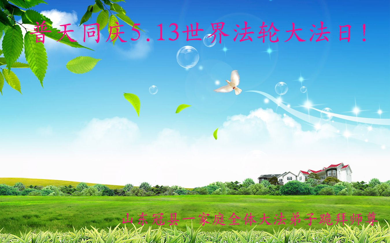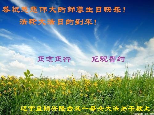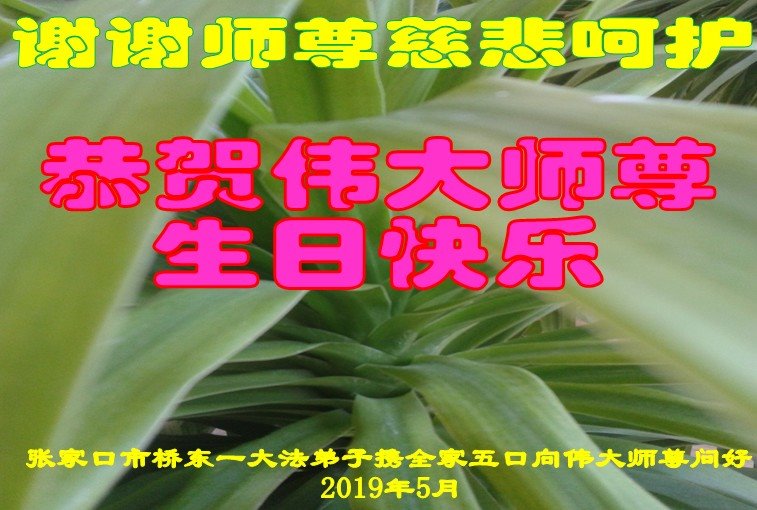 “五·一三”世界法轮大法日暨慈悲伟大师父的华诞到了!我们一家同修三人及我们现在的学法小组全体弟子在此衷心恭祝慈悲伟大的师父生日快乐!发自内心的感恩慈悲无量的伟大的师父!是您的慈悲救度,弟子们才有了今天。