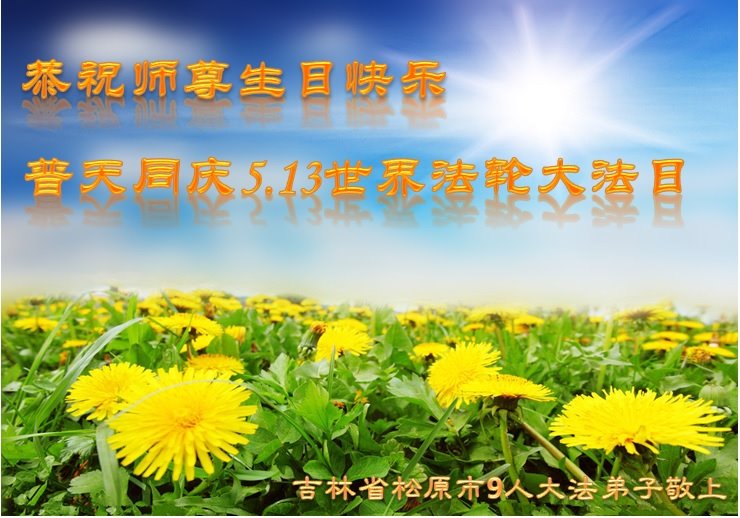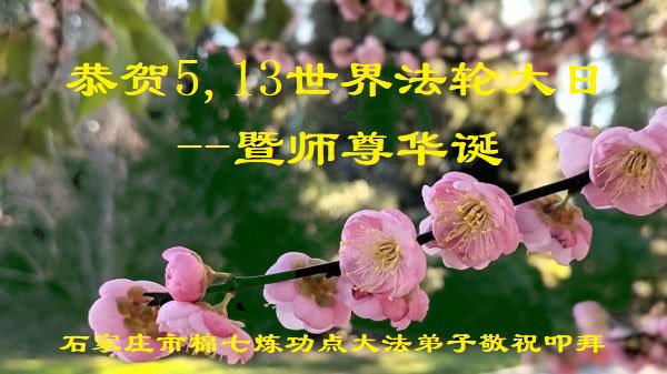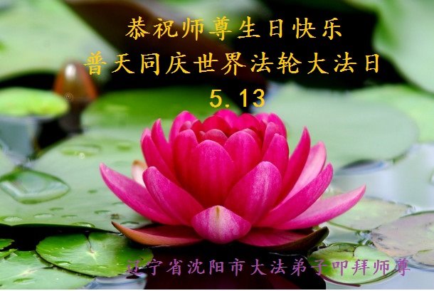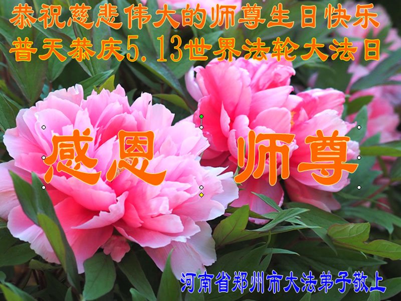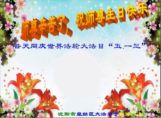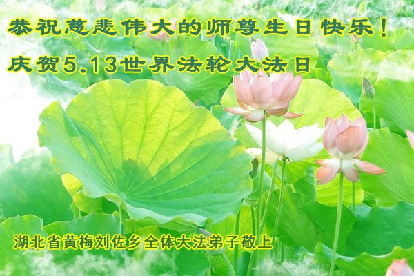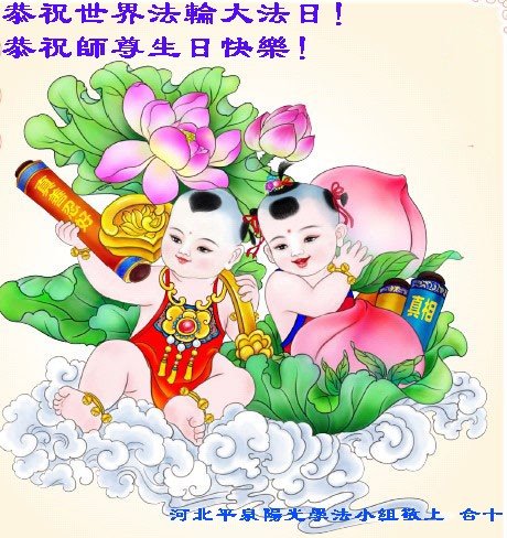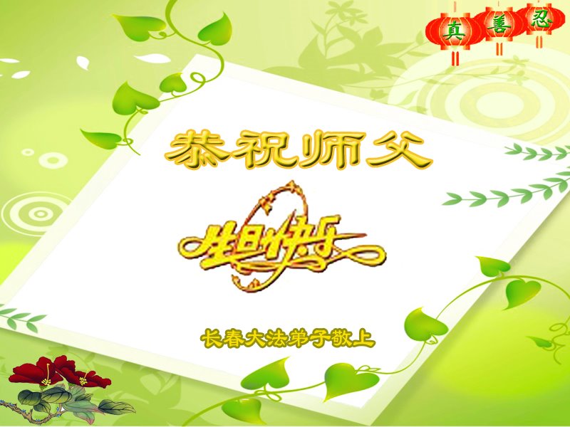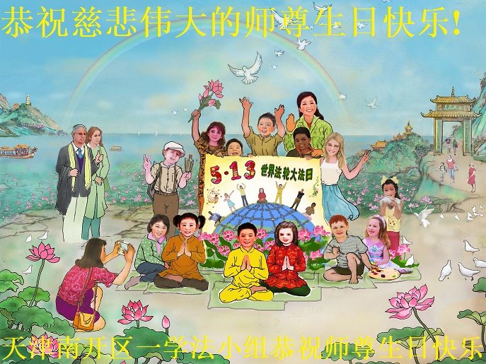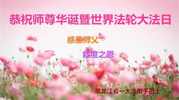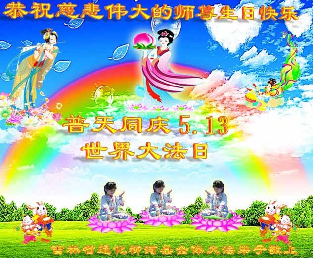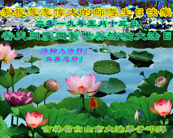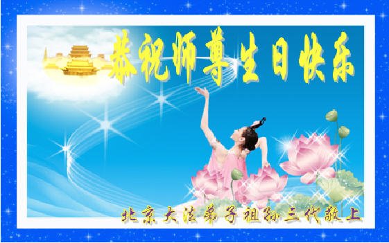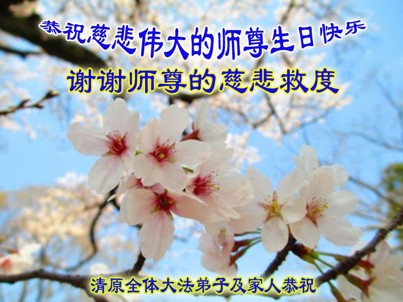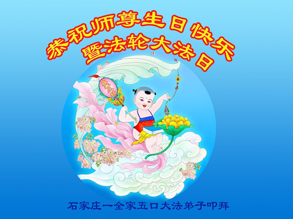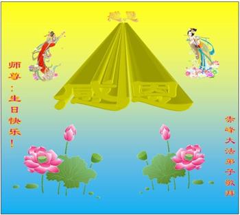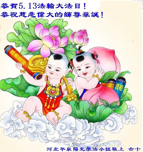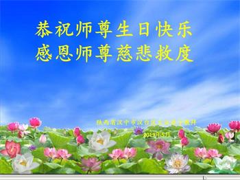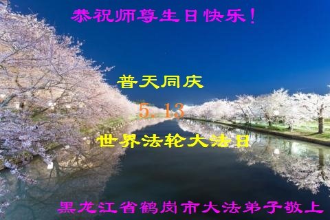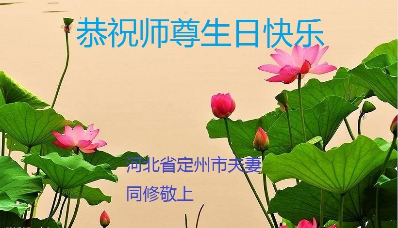“五·一三”世界法轮大法日暨慈悲伟大师父的华诞到了!我们一家同修三人及我们现在的学法小组全体弟子在此衷心恭祝慈悲伟大的师父生日快乐!发自内心的感恩慈悲无量的伟大的师父!是您的慈悲救度,弟子们才有了今天。