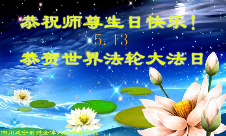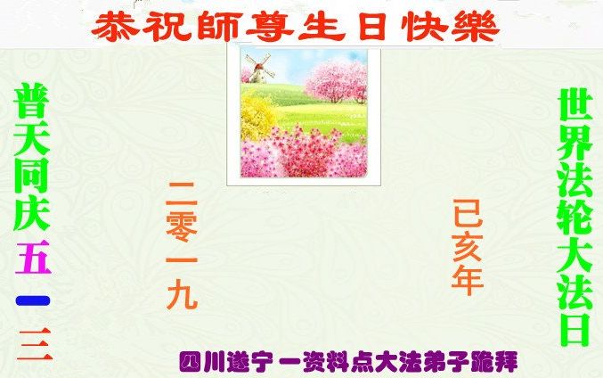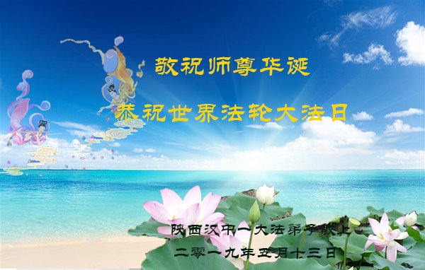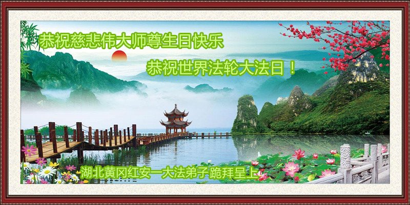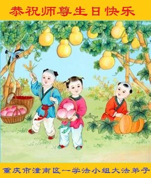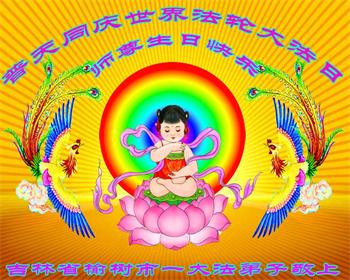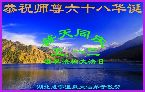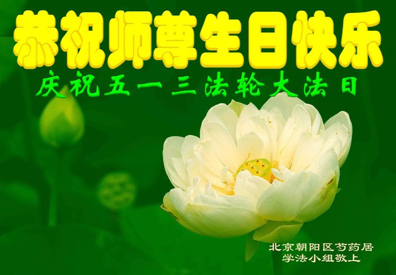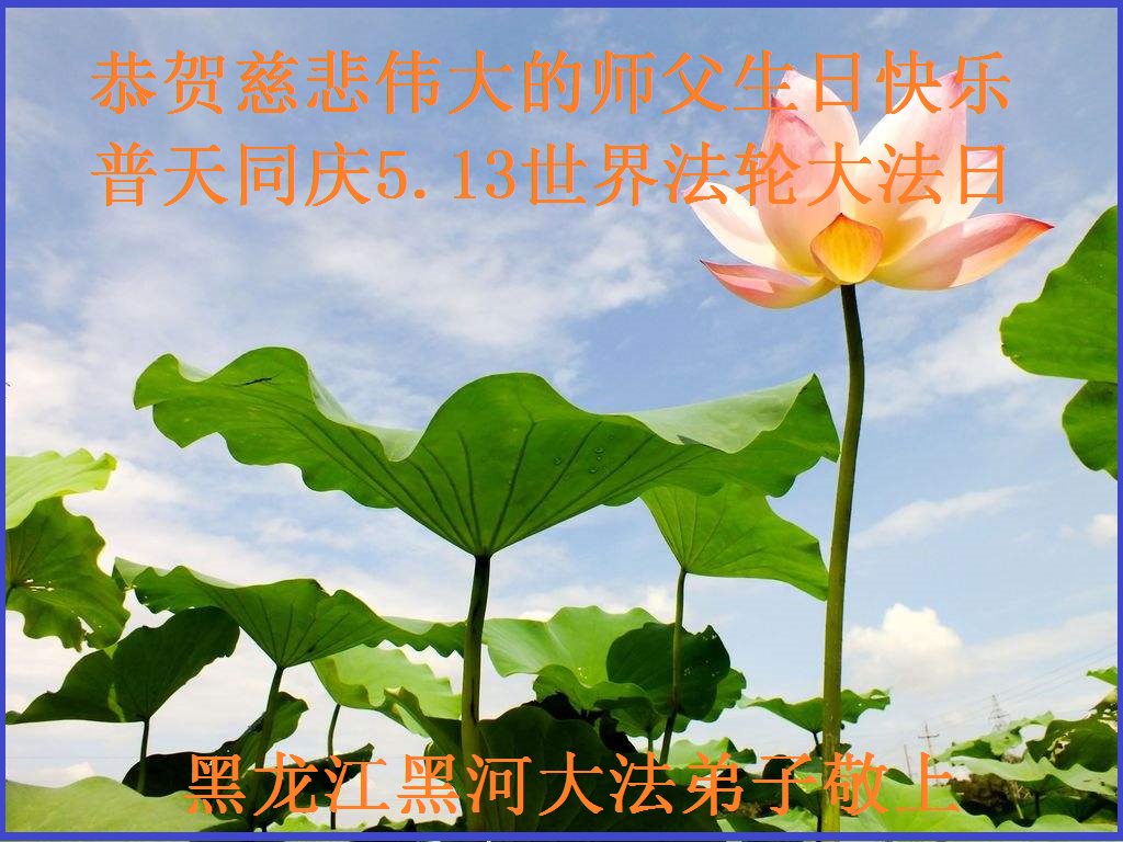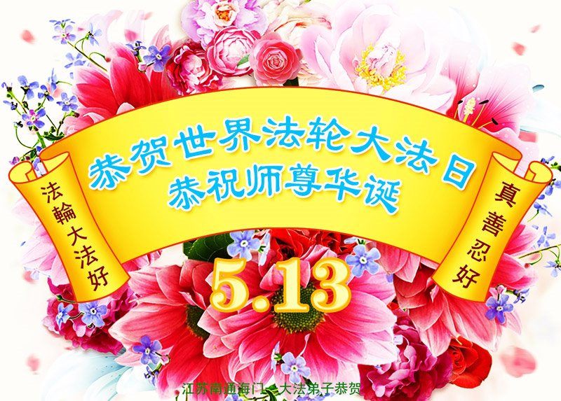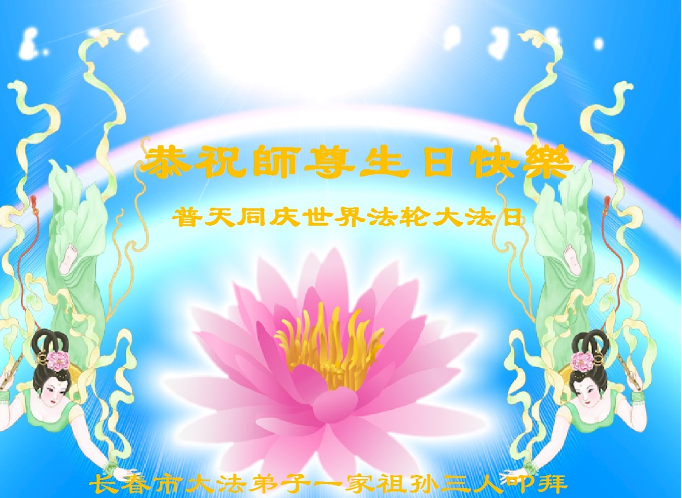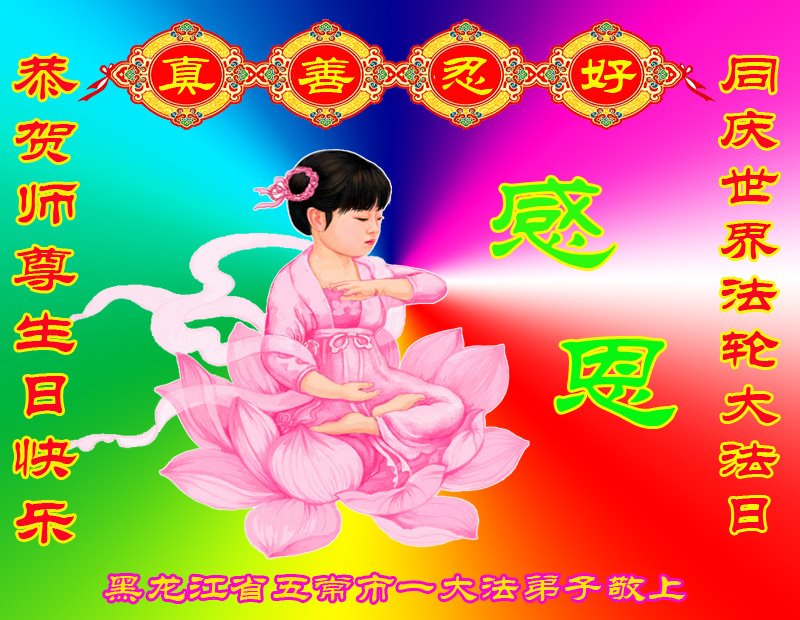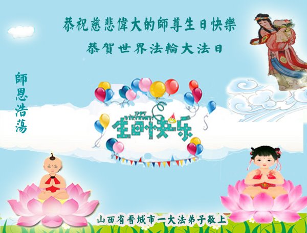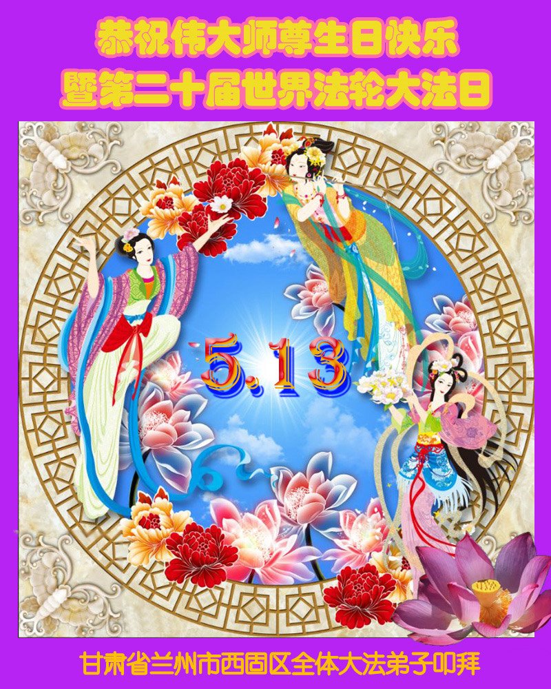 “五·一三”世界法轮大法日暨慈悲伟大师父的华诞到了!我们一家同修三人及我们现在的学法小组全体弟子在此衷心恭祝慈悲伟大的师父生日快乐!发自内心的感恩慈悲无量的伟大的师父!是您的慈悲救度,弟子们才有了今天。
