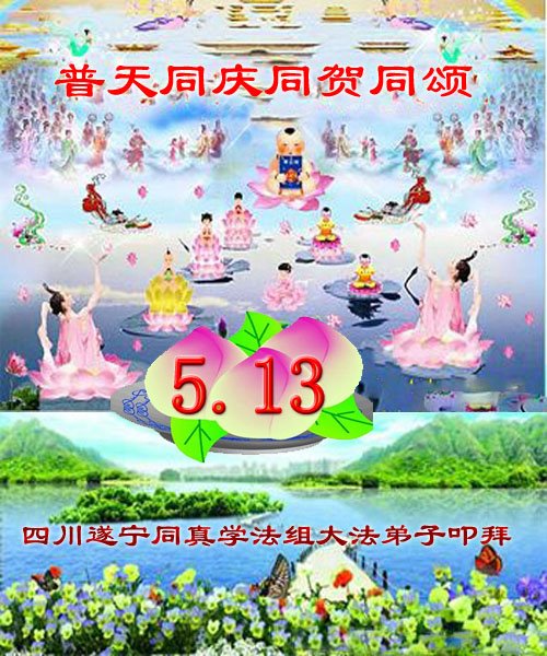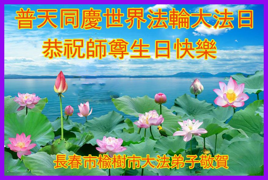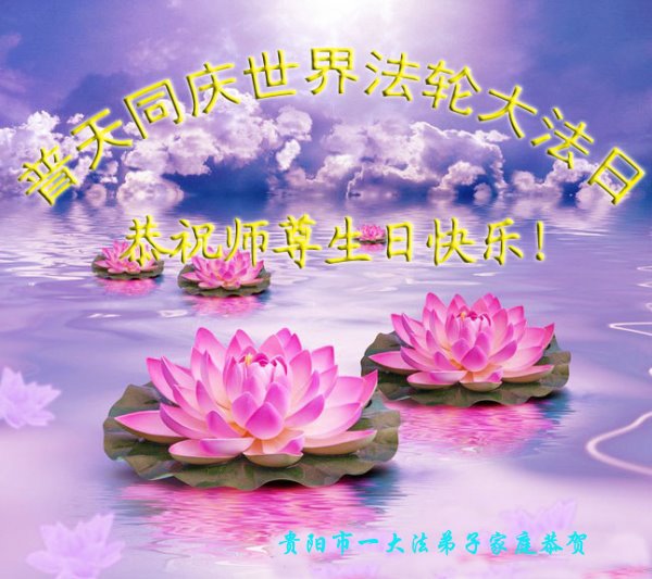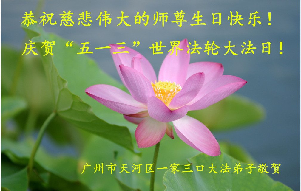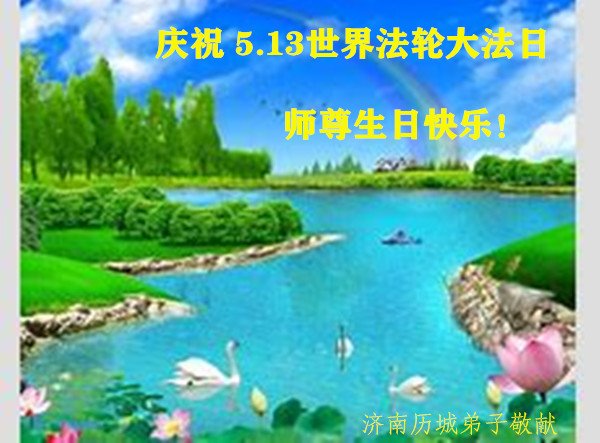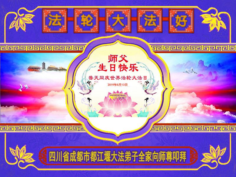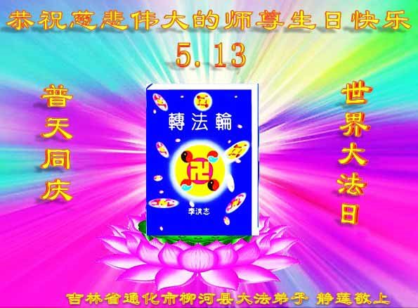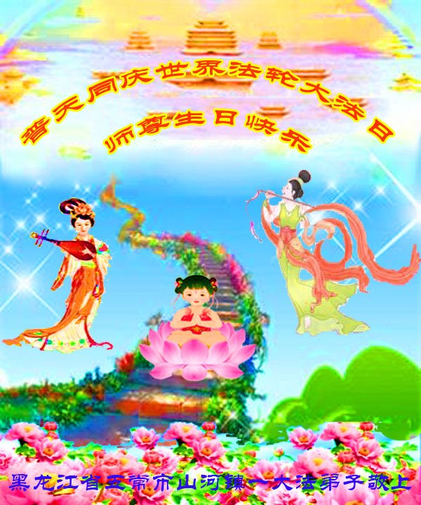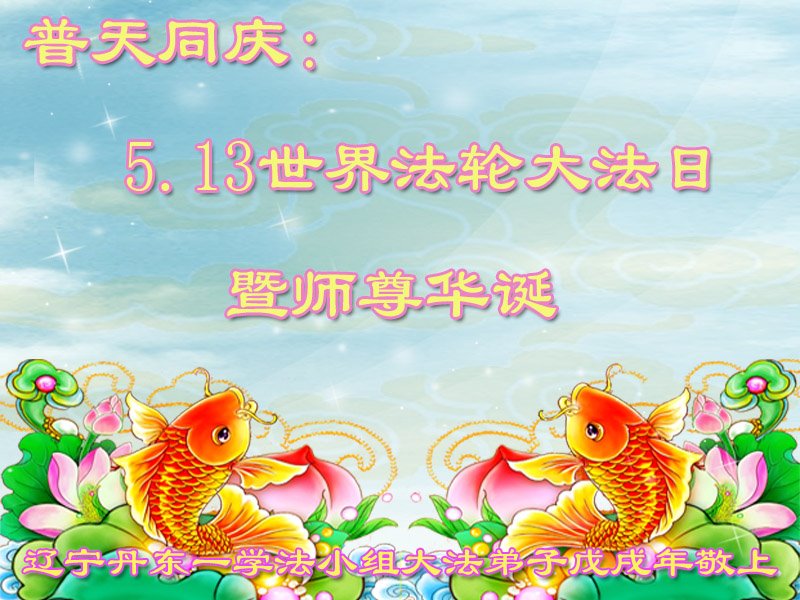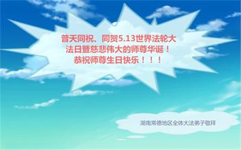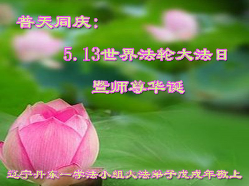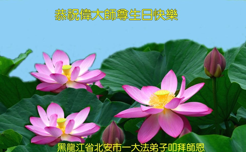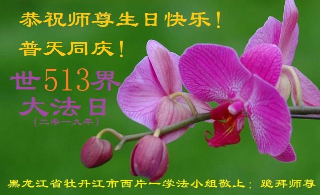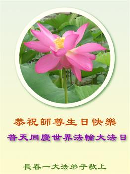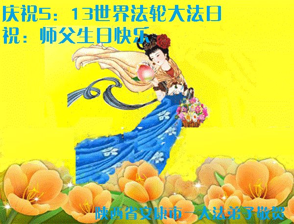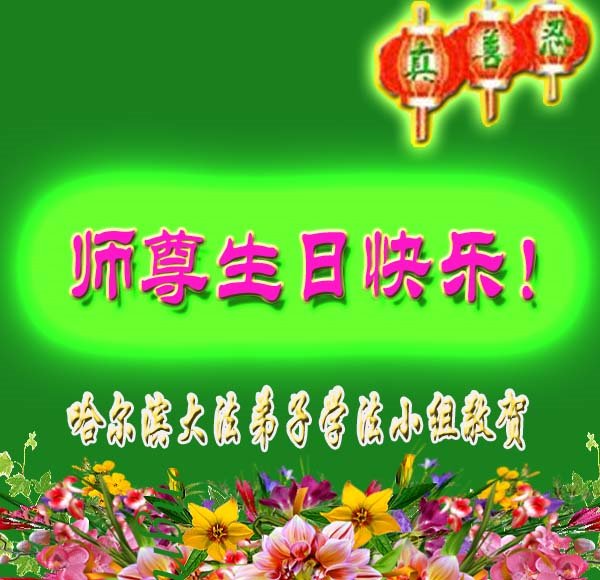 “五·一三”世界法轮大法日暨慈悲伟大师父的华诞到了!我们一家同修三人及我们现在的学法小组全体弟子在此衷心恭祝慈悲伟大的师父生日快乐!发自内心的感恩慈悲无量的伟大的师父!是您的慈悲救度,弟子们才有了今天。