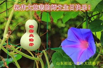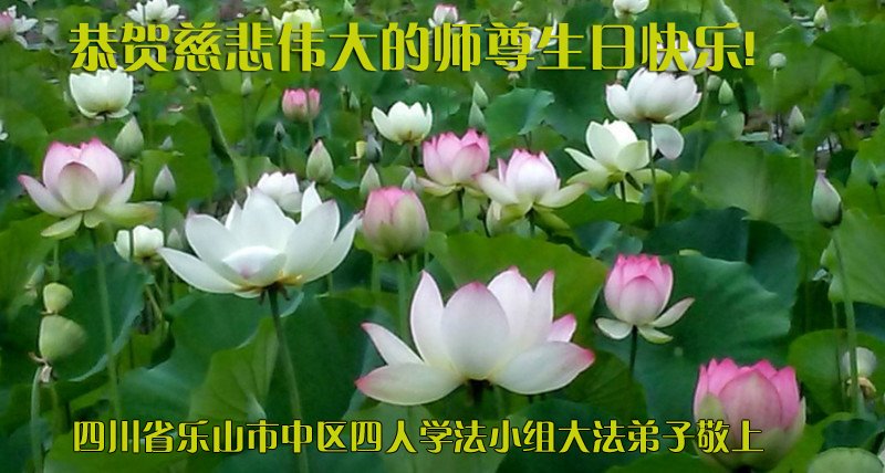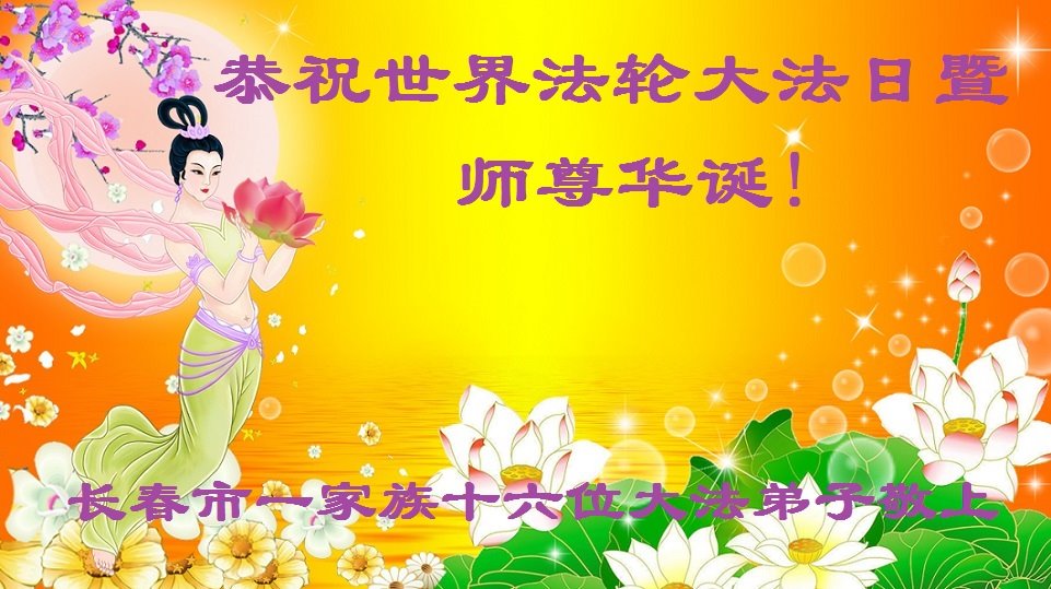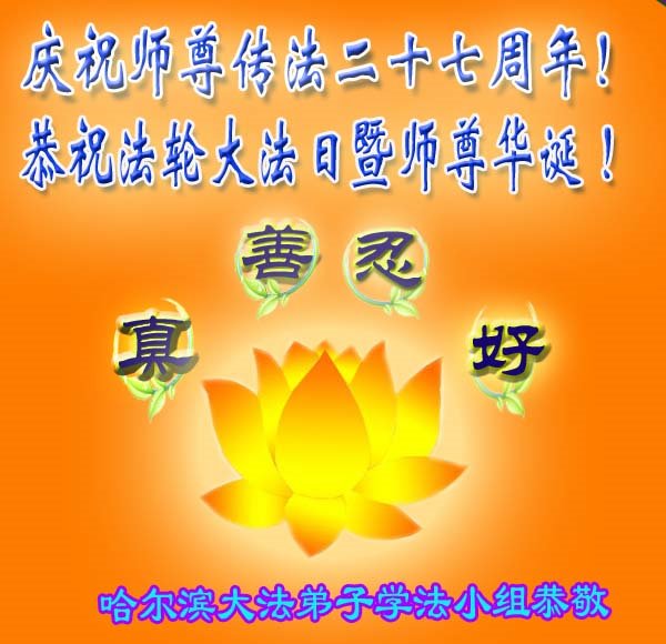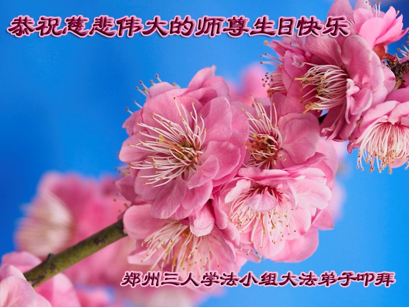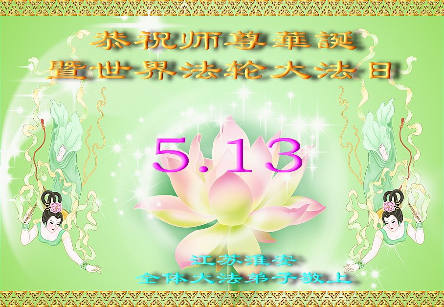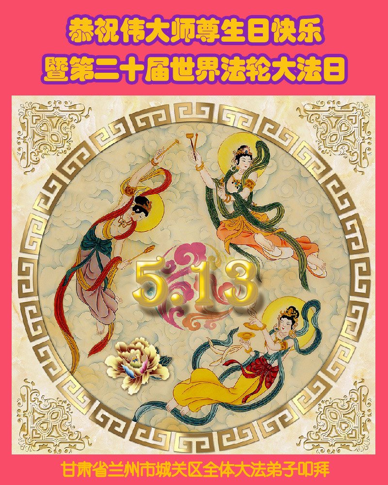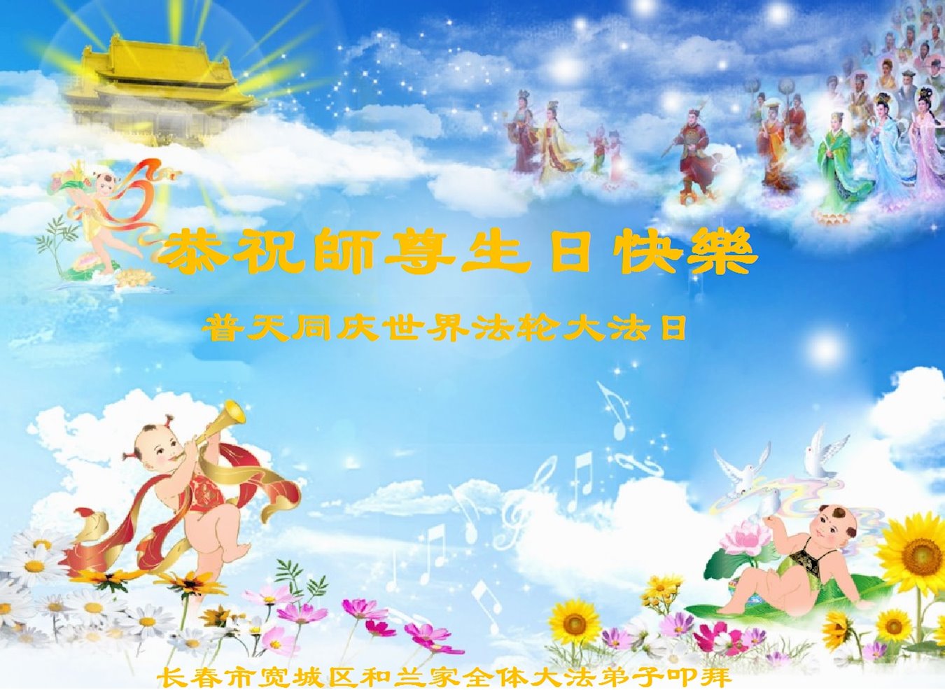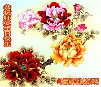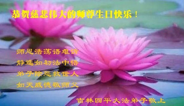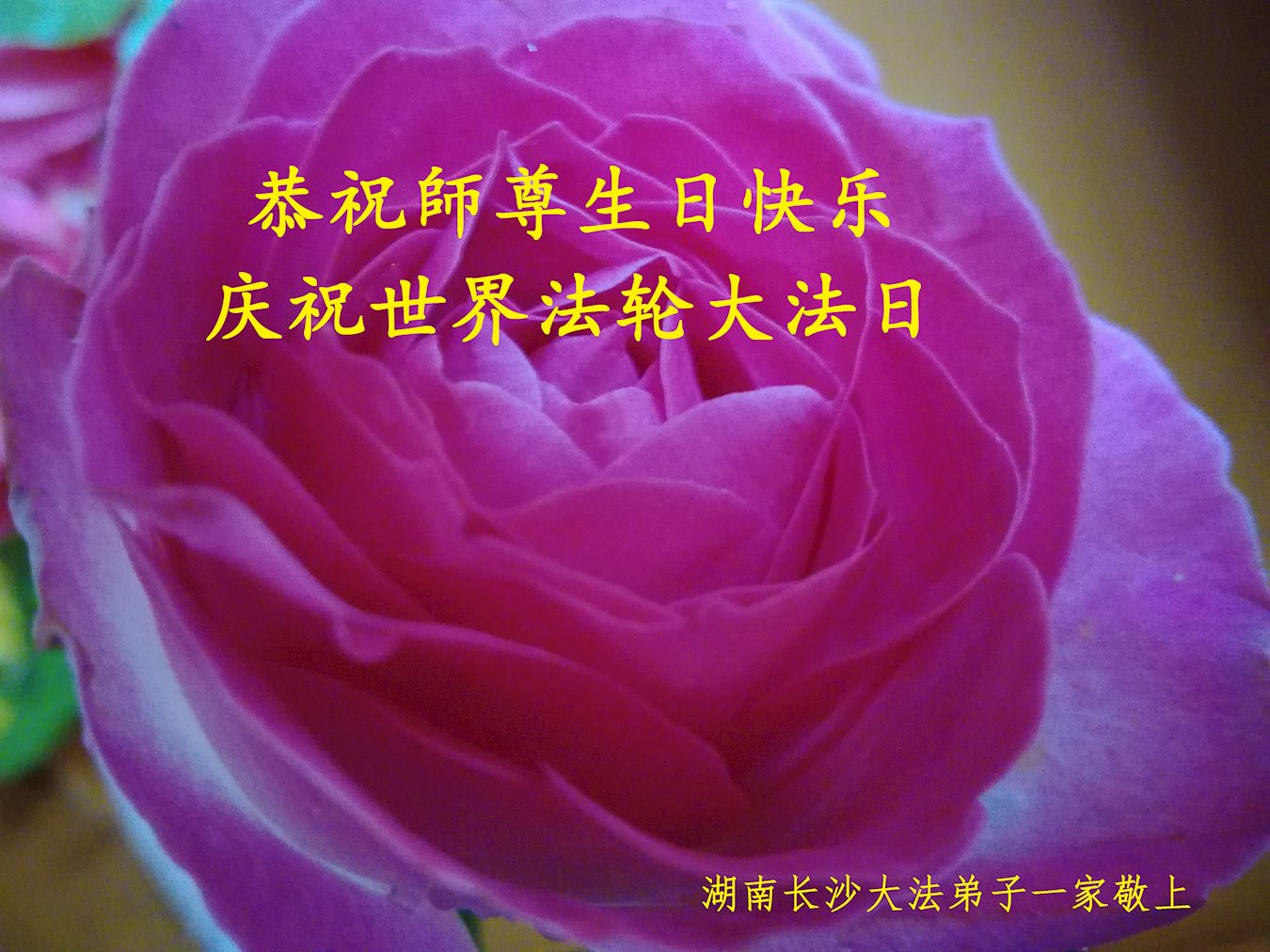 “五·一三”世界法轮大法日暨慈悲伟大师父的华诞到了!我们一家同修三人及我们现在的学法小组全体弟子在此衷心恭祝慈悲伟大的师父生日快乐!发自内心的感恩慈悲无量的伟大的师父!是您的慈悲救度,弟子们才有了今天。