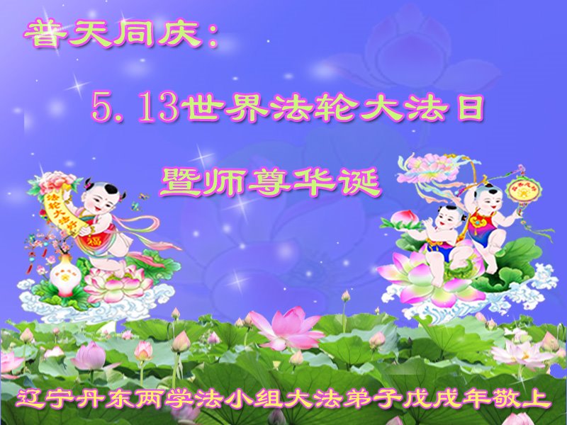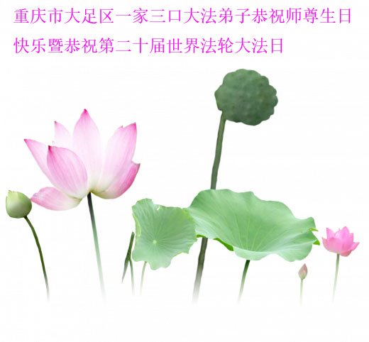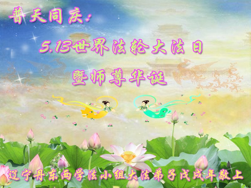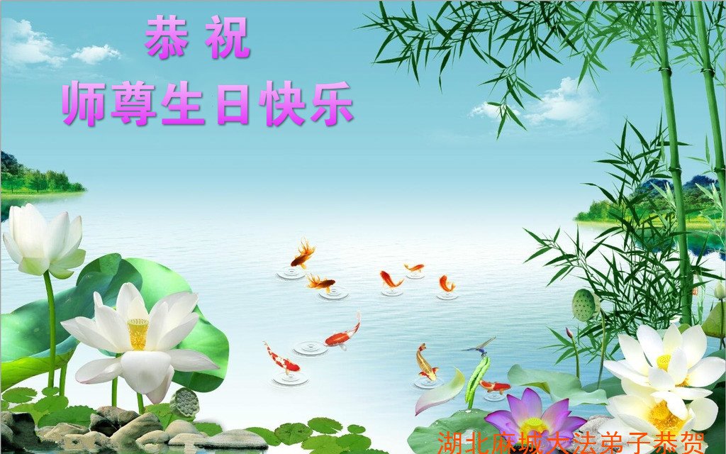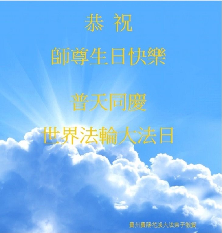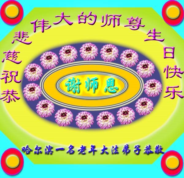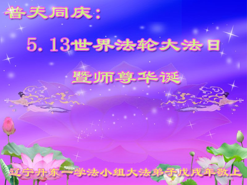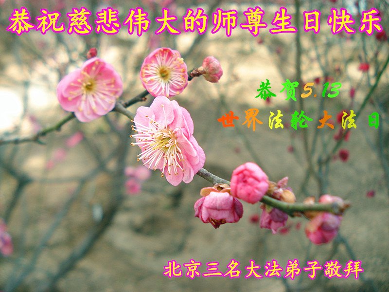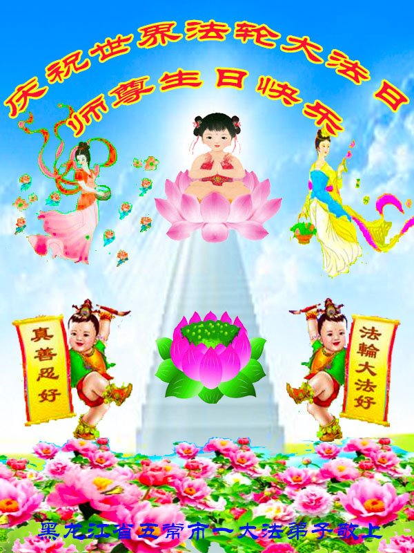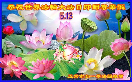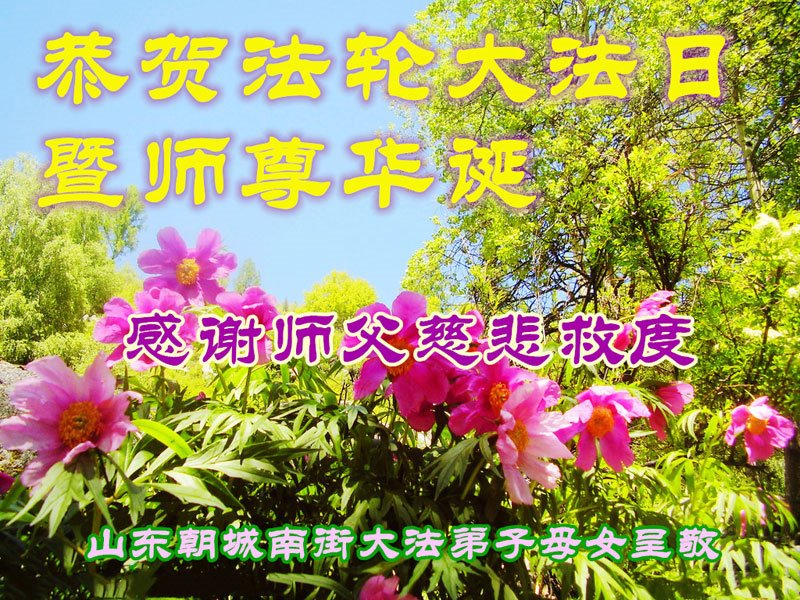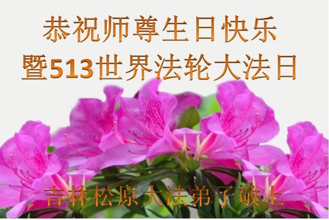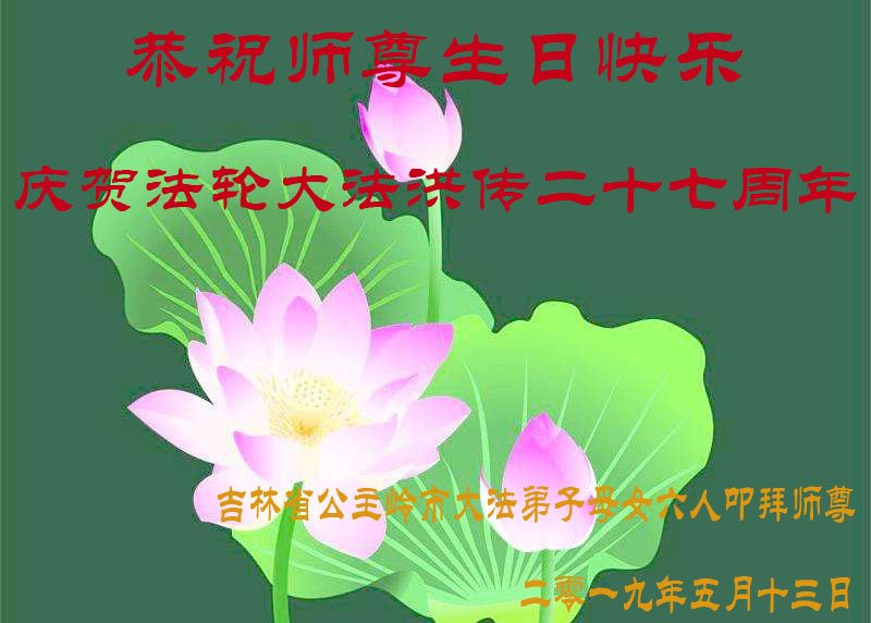 “五·一三”世界法轮大法日暨慈悲伟大师父的华诞到了!我们一家同修三人及我们现在的学法小组全体弟子在此衷心恭祝慈悲伟大的师父生日快乐!发自内心的感恩慈悲无量的伟大的师父!是您的慈悲救度,弟子们才有了今天。