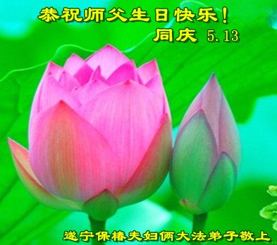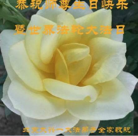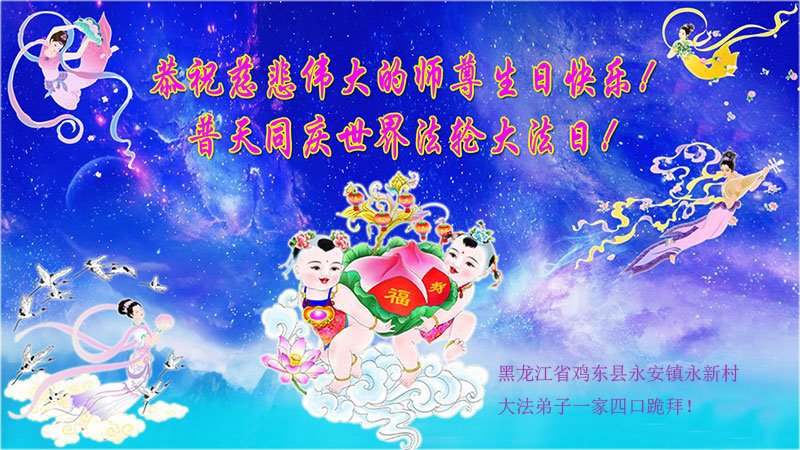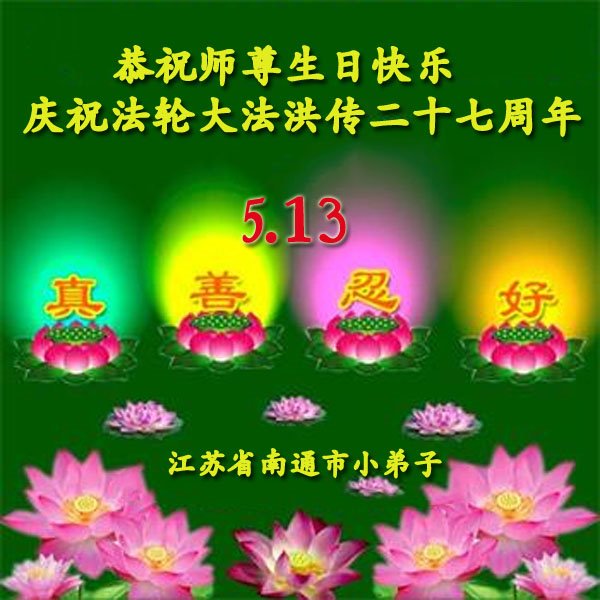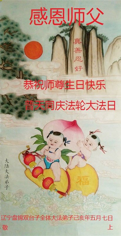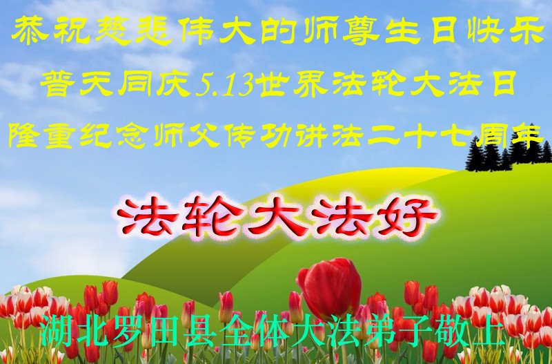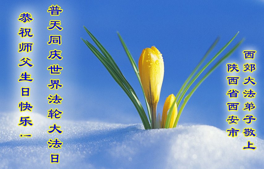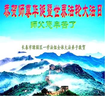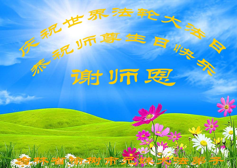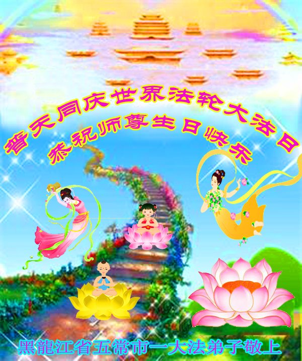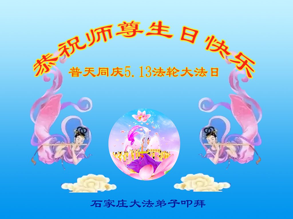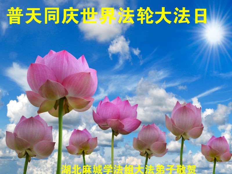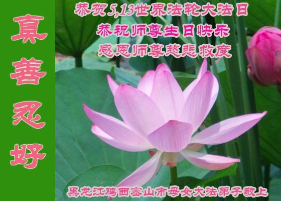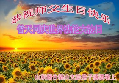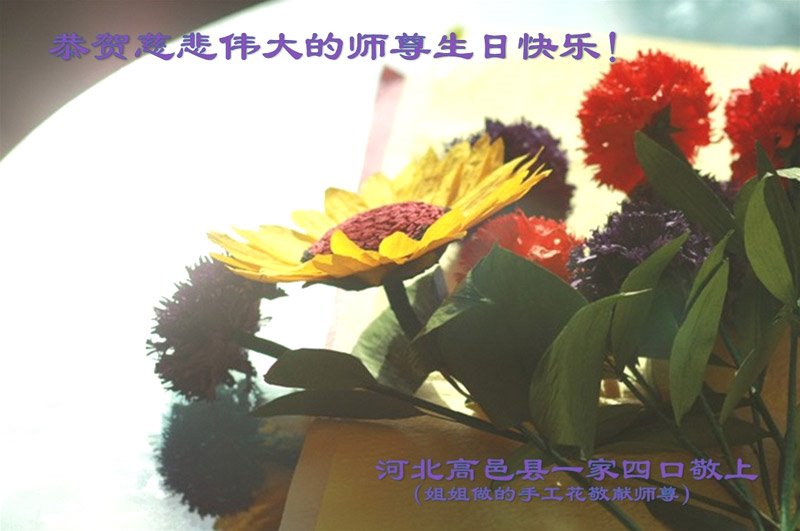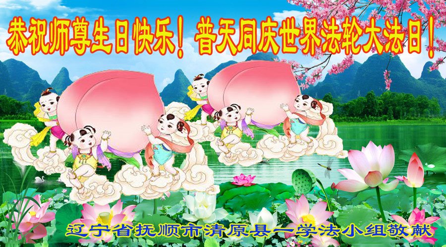 “五·一三”世界法轮大法日暨慈悲伟大师父的华诞到了!我们一家同修三人及我们现在的学法小组全体弟子在此衷心恭祝慈悲伟大的师父生日快乐!发自内心的感恩慈悲无量的伟大的师父!是您的慈悲救度,弟子们才有了今天。