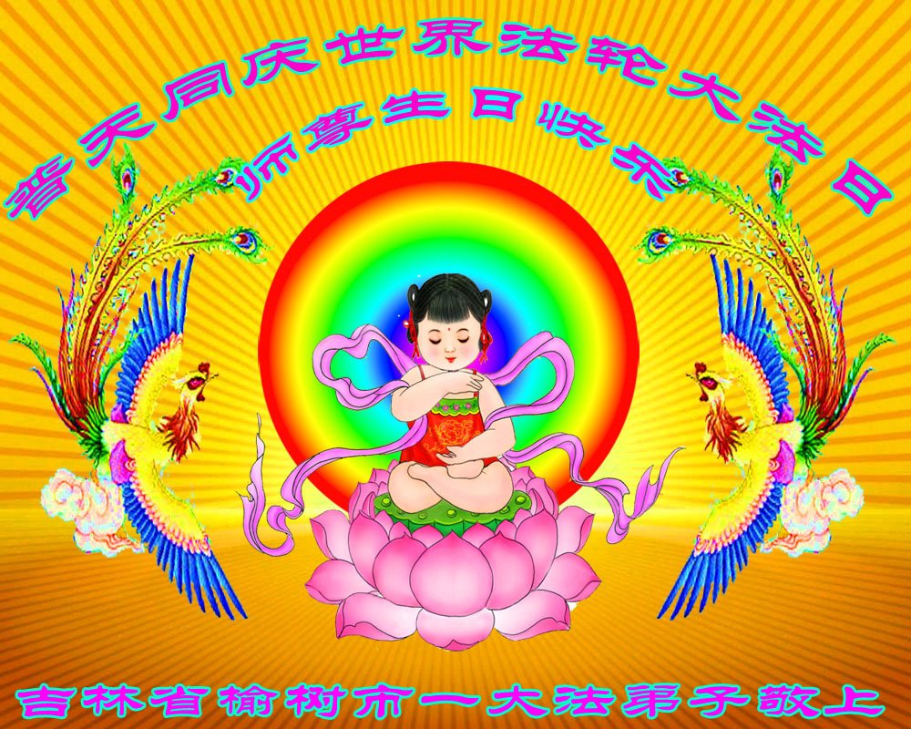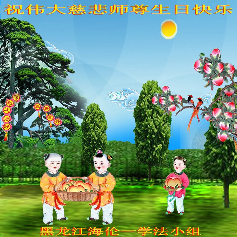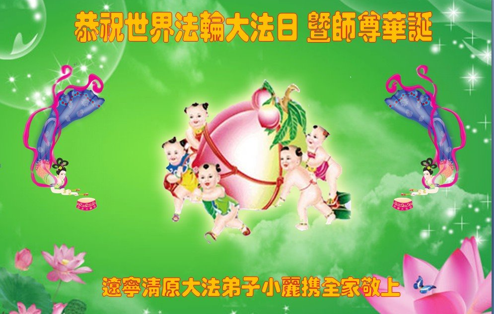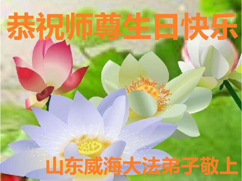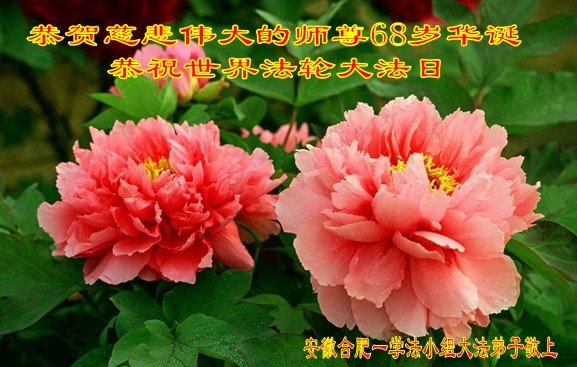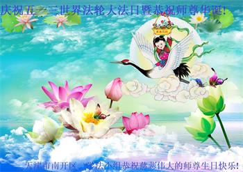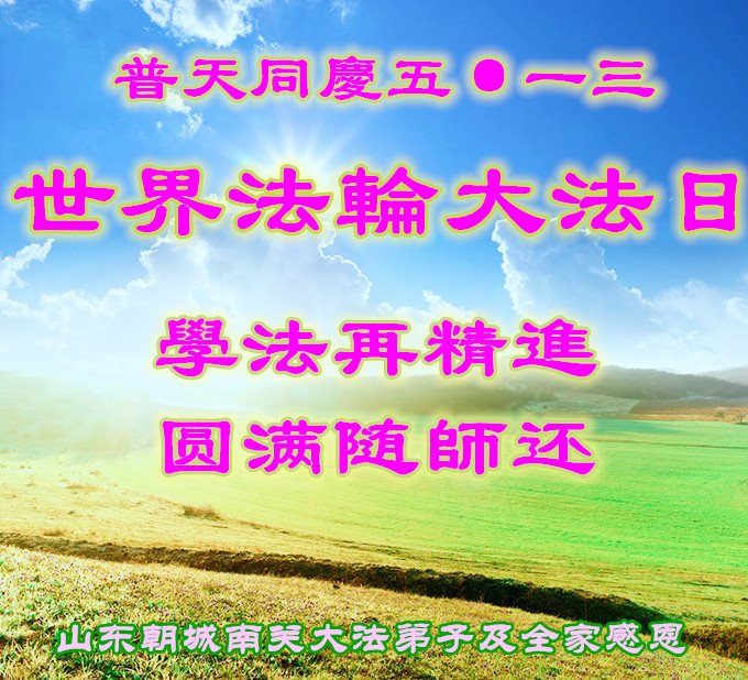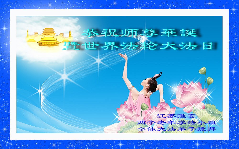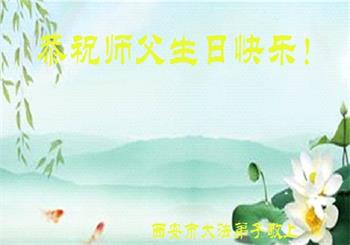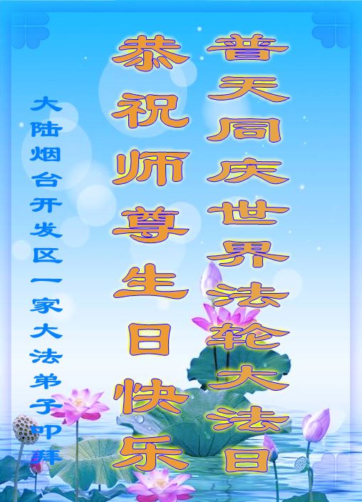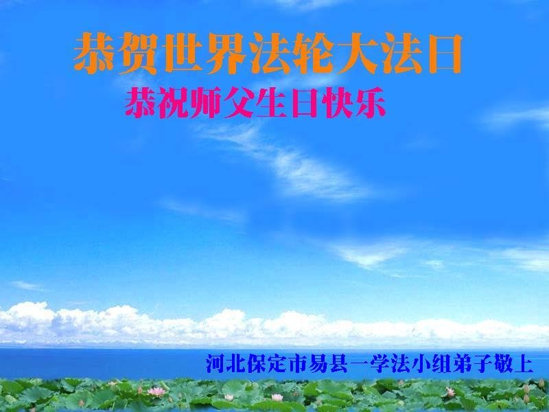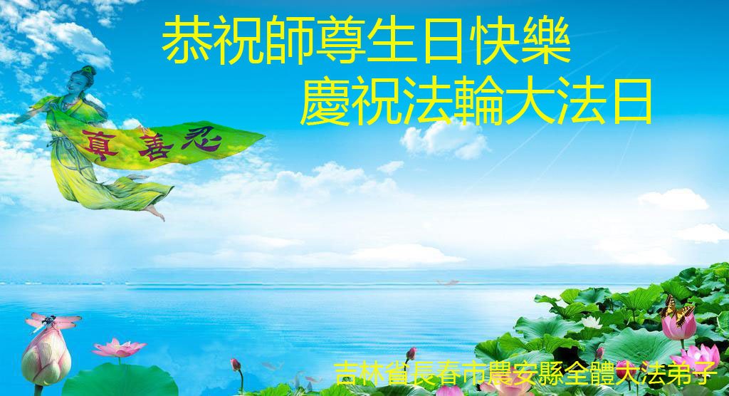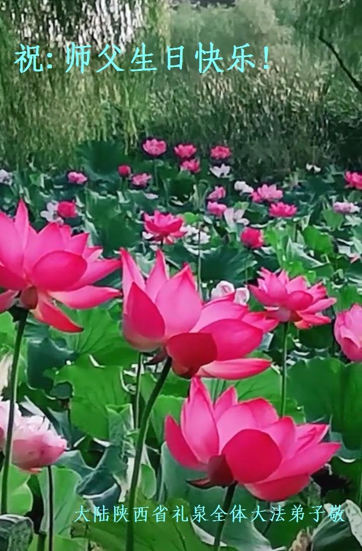 “五·一三”世界法轮大法日暨慈悲伟大师父的华诞到了!我们一家同修三人及我们现在的学法小组全体弟子在此衷心恭祝慈悲伟大的师父生日快乐!发自内心的感恩慈悲无量的伟大的师父!是您的慈悲救度,弟子们才有了今天。
