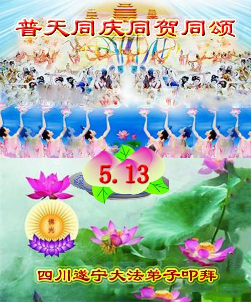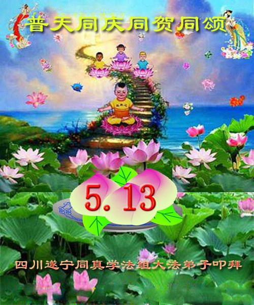 五月十三日是伟大而殊胜的日子。师父伟大!法轮大法伟大!弟子们和众生万物都沐浴在金光闪闪的法光中,弟子们合十真心跪拜师父:无限感恩师父的慈悲苦度!