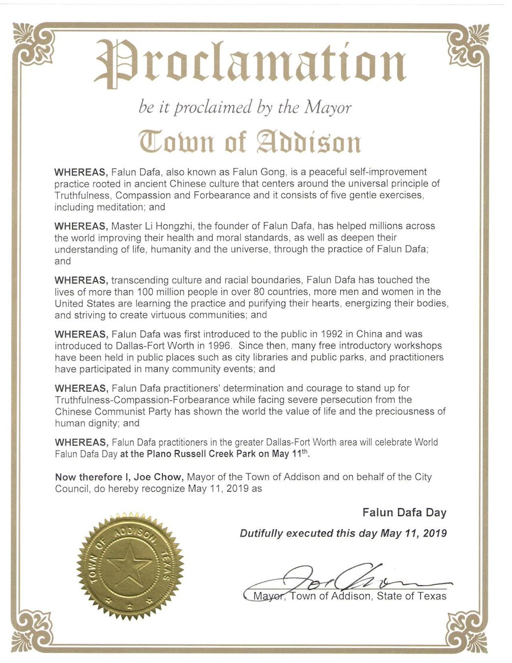 ![]() 图2:美国德州爱迪逊市(City of Addison)宣布“法轮大法日” |