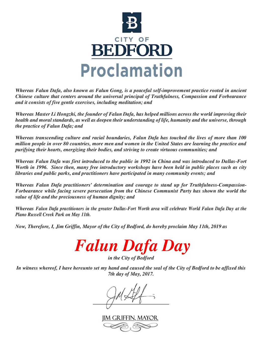 因此,我,吉姆·格瑞分,伯德福特市市长及市议会,宣布二零一九年五月十一日为“法轮大法日”。