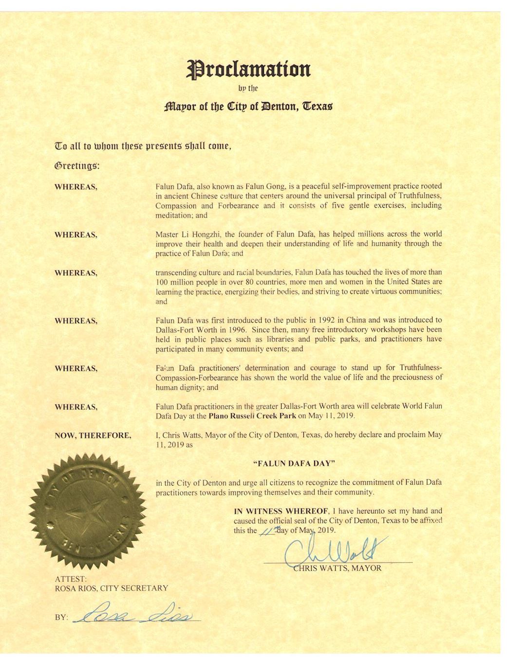 鉴此,我,科利斯·瓦特斯(ChrisWatts),丹顿市市长,宣布二零一九年五月十一日为德州丹顿市“法轮大法日”。