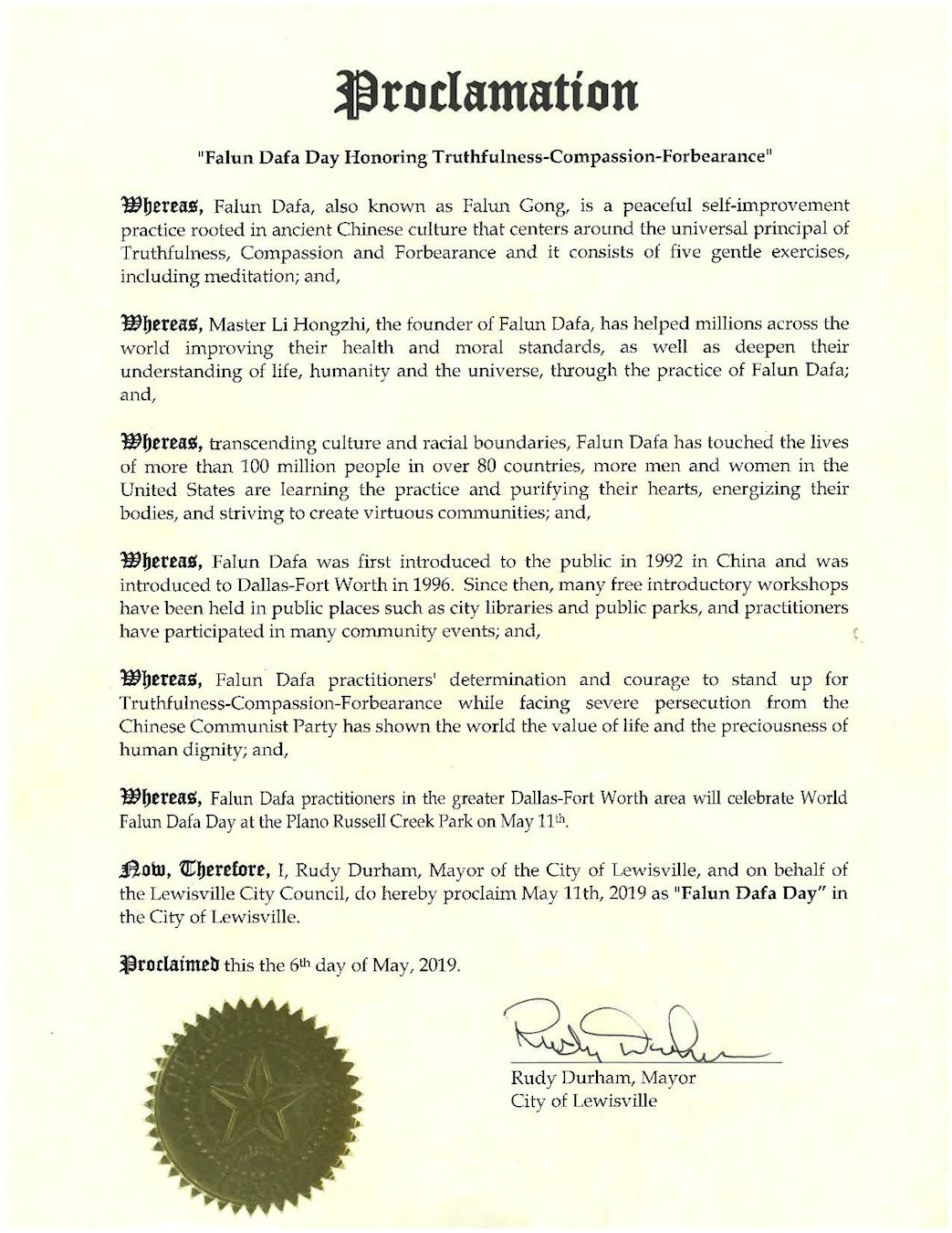鉴此,我,鲁迪·达勒姆(Rudy Durham),路易斯维尔市市长,宣布二零一九年五月十一日为德州路易斯维尔市“法轮大法日表彰真、善、忍”。