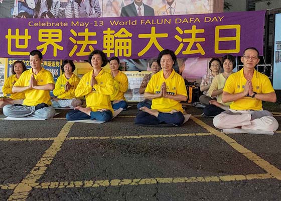 台湾高雄法轮功学员以各种方式庆祝法轮大法日暨师尊华诞,在人潮涌动的瑞丰夜市张灯结彩,炼功弘法讲真相。