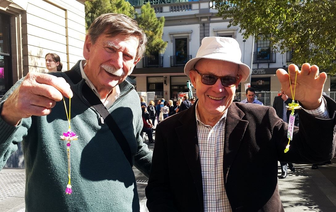 在悉尼重点高中读书的两位韩国女孩珍妮特·金(Janet K)和阿什利·颂(Ashley C)高兴的看着手中的莲花议论着。她们表示:在这之前我们并不知道法轮功,可是今天我们刚刚在公交车上讨论打坐,因为我们下周要考试,现在需要放松一下,我们正在讨论是不是要去找一种打坐的方法减压,所以决定下车去走一走。那么巧,我们马上就看到法轮功游行队伍了。我们说:哇!好美呀!这游行看上去确实很祥和、优美,很吸引我们。这正是我们要寻找的祥和打坐方法!我们还得到了莲花,我们将把莲花带到考场,它定会带给我们祥和与放松。我们很高兴今天让我们幸遇这么好的一幕(法轮功游行)。