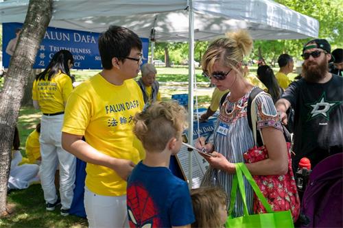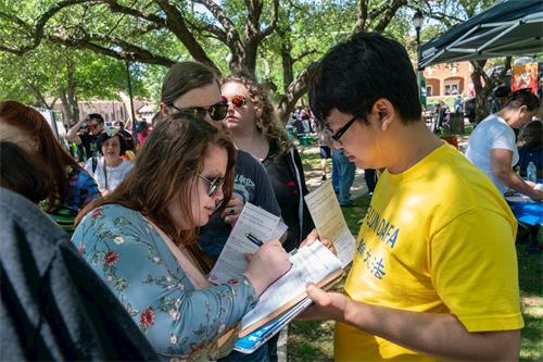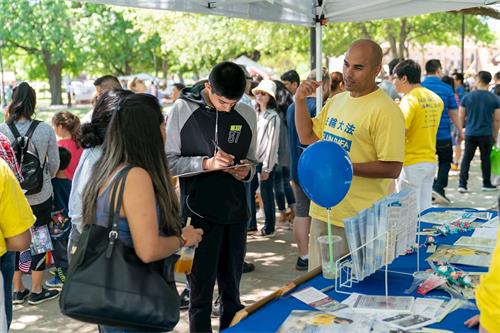 珍妮(Jenny)是位学生,她在Youtube上偶然了解到了中共迫害法轮功的情况,并告诉了她的好友妲娜(Dana),她们在亚裔节活动上看到了法轮大法的摊位后主动过来跟学员交谈。珍妮说:“在了解到这些迫害仍在进行时,我感到非常不可思议,这一情况听起来真的很糟糕。”珍妮和妲娜都在征签板上签字,希望早日终止这场迫害。