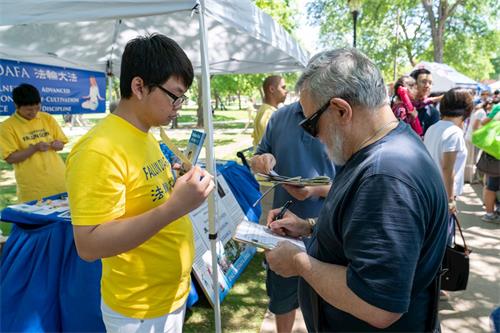 两位女士,康尼(Connie)和玛利亚(Marie),结伴来亚洲节游玩,在路过法轮大法的展位时,康尼兴奋地说这就是她在神韵中看到的那个在中国遭受迫害的团体,她对法轮功以及中共迫害法轮功学员的事情有所了解。在听过学员的介绍后,玛利亚说道:“我对在中国遭受这些迫害的人感到非常痛心。”她表示,此前去中国旅游时,她根本就没有听说过这些事情。她说:非常感谢你们能走出来,为那些受迫害的人发声,你们做的非常好。两位女士都签名呼吁制止中共迫害法轮功。